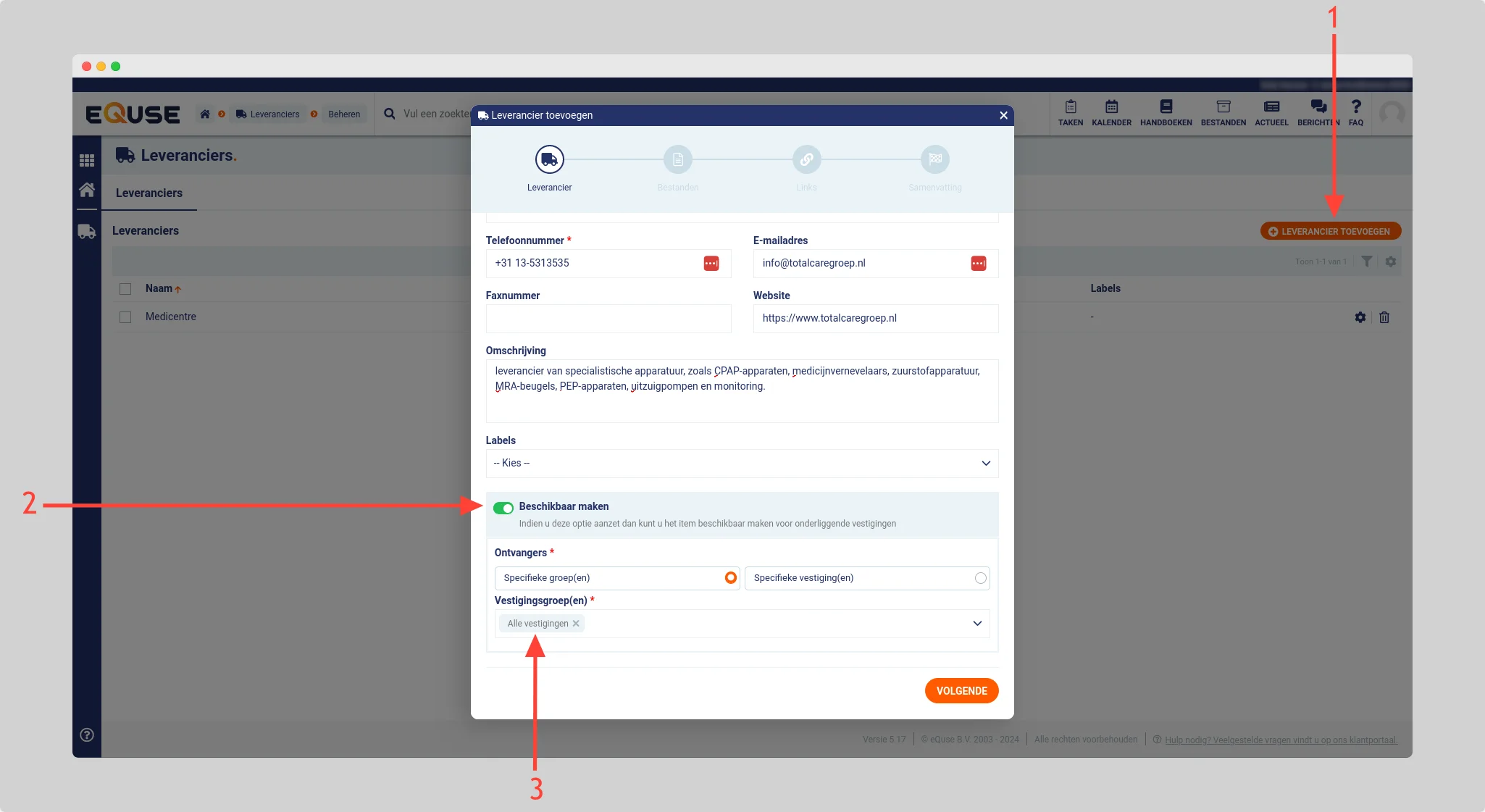 Vul de gegevens van de leverancier in en activeer de optie beschikbaar maken (2).