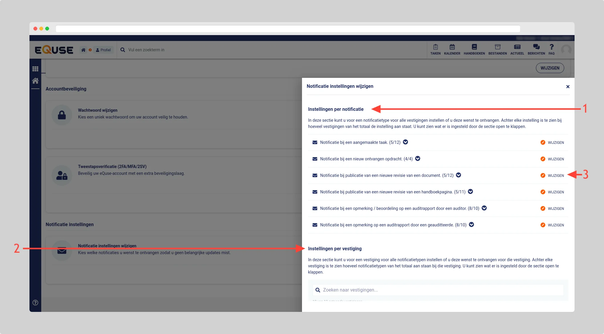 - U kunt de notificatie-instellingen per notificatie (1), of (als u toegang heeft tot meerdere vestigingen) per vestiging (2) instellen door op wijzigen (3) te klikken. Dit kan handig zijn wanneer u een specifieke notificatie bij meerdere vestigingen aan of uit wilt zetten, of juist voor een specifieke vestiging meerdere notificaties wilt aan of uitzetten.