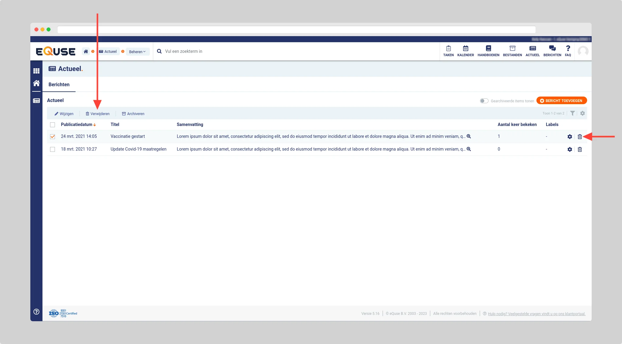 - Selecteer het bericht dat u wilt wijzigen door het selectievakje aan te klikken en klik op verwijderen of klik op het prullenbak icoontje.