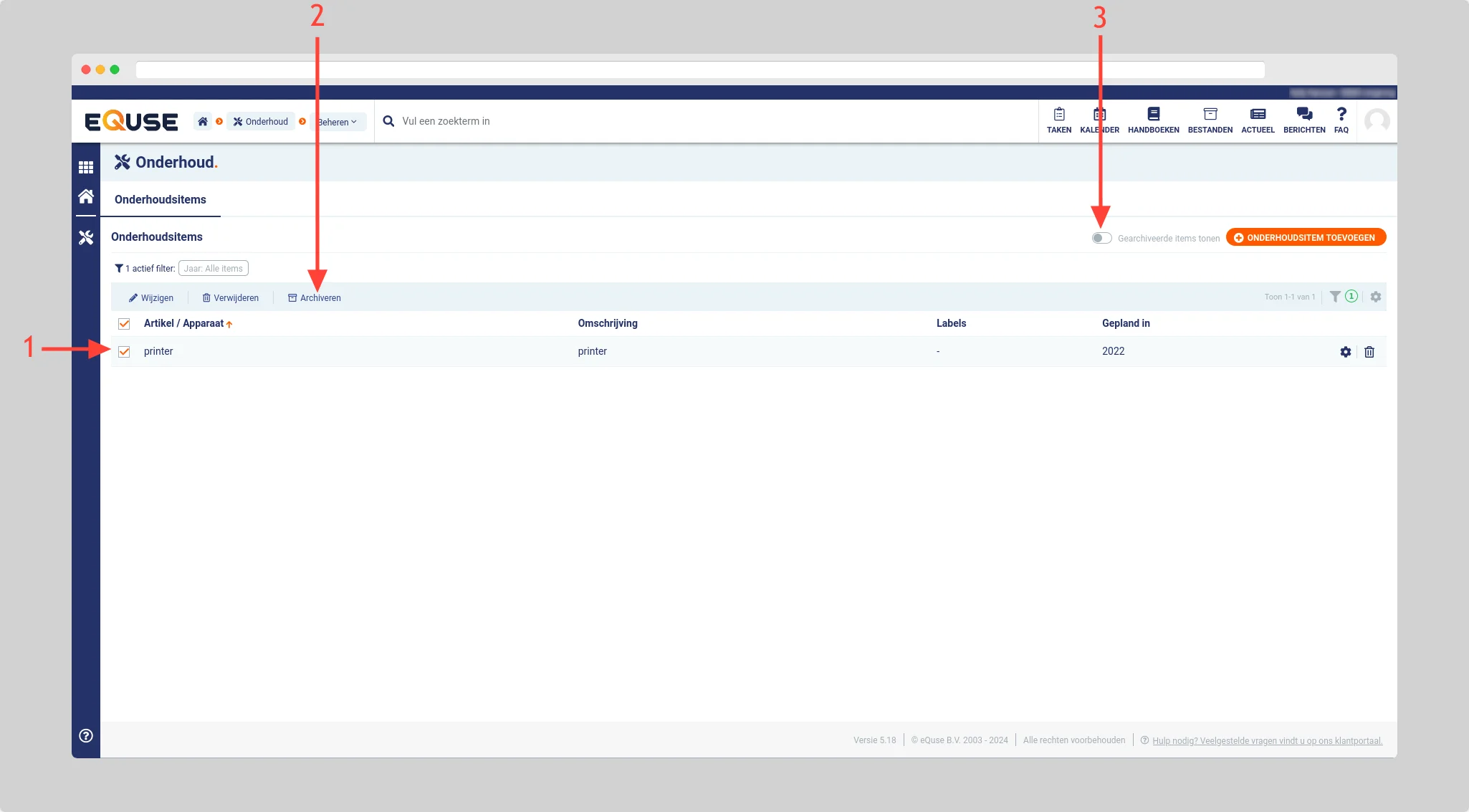 U kunt alle gearchiveerde onderhoudsitems weergeven door de optie gearchiveerde items tonen (3) aan te klikken.