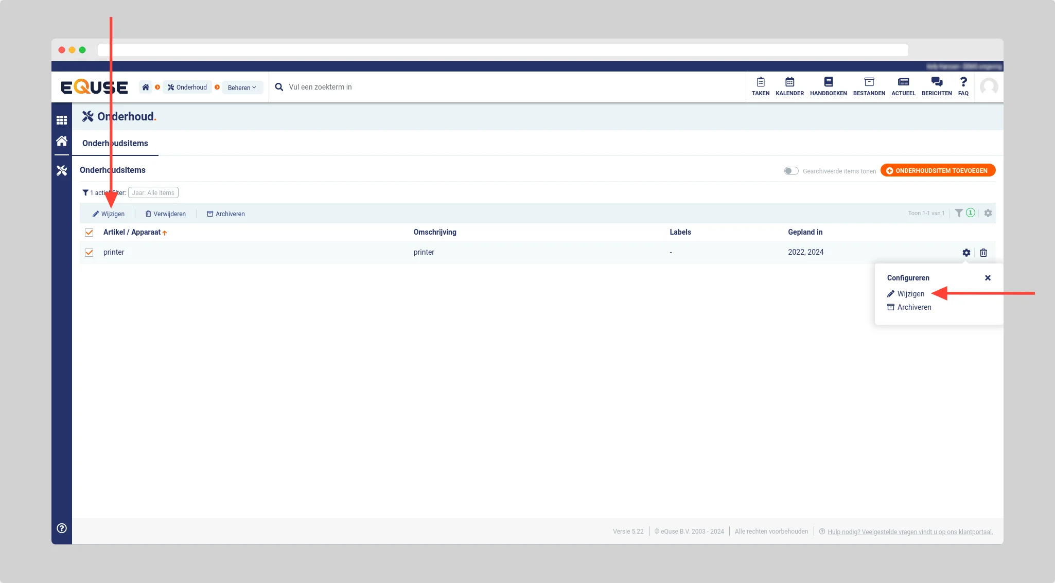 - Selecteer het onderhoudsitem dat u wilt wijzigen door het selectievakje aan te klikken en klik op wijzigen.