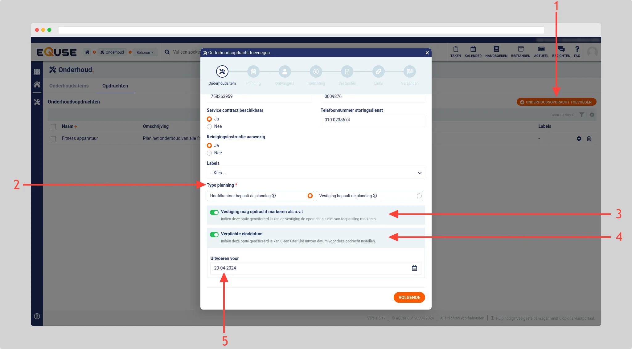 Afhankelijk van het geselecteerde type planning en/of de mogelijkheid voor de vestiging om de opdracht als niet van toepassing te markeren, kunt u een verplichte einddatum instellen (4) en de datum invullen (5) waarop de opdracht uiterlijk moet worden uitgevoerd door de vestiging.