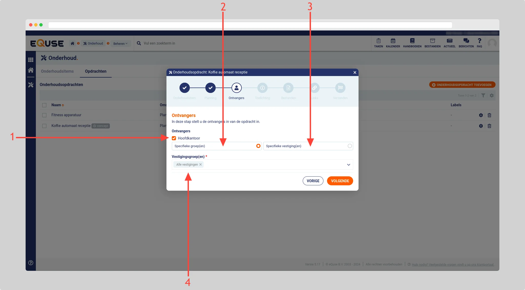 De optie hoofdkantoor (1) is optioneel en geeft u de mogelijkheid om de opdracht ook naar het huidige ingelogde hoofdkantoor (opdrachtgever) te verzenden. Selecteer de optie specifieke groepen (2) wanneer u de opdracht naar specifieke vestigingsgroepen wilt verzenden of de optie specifieke vestigingen (3) om de opdracht naar specifieke vestigingen te verzenden.