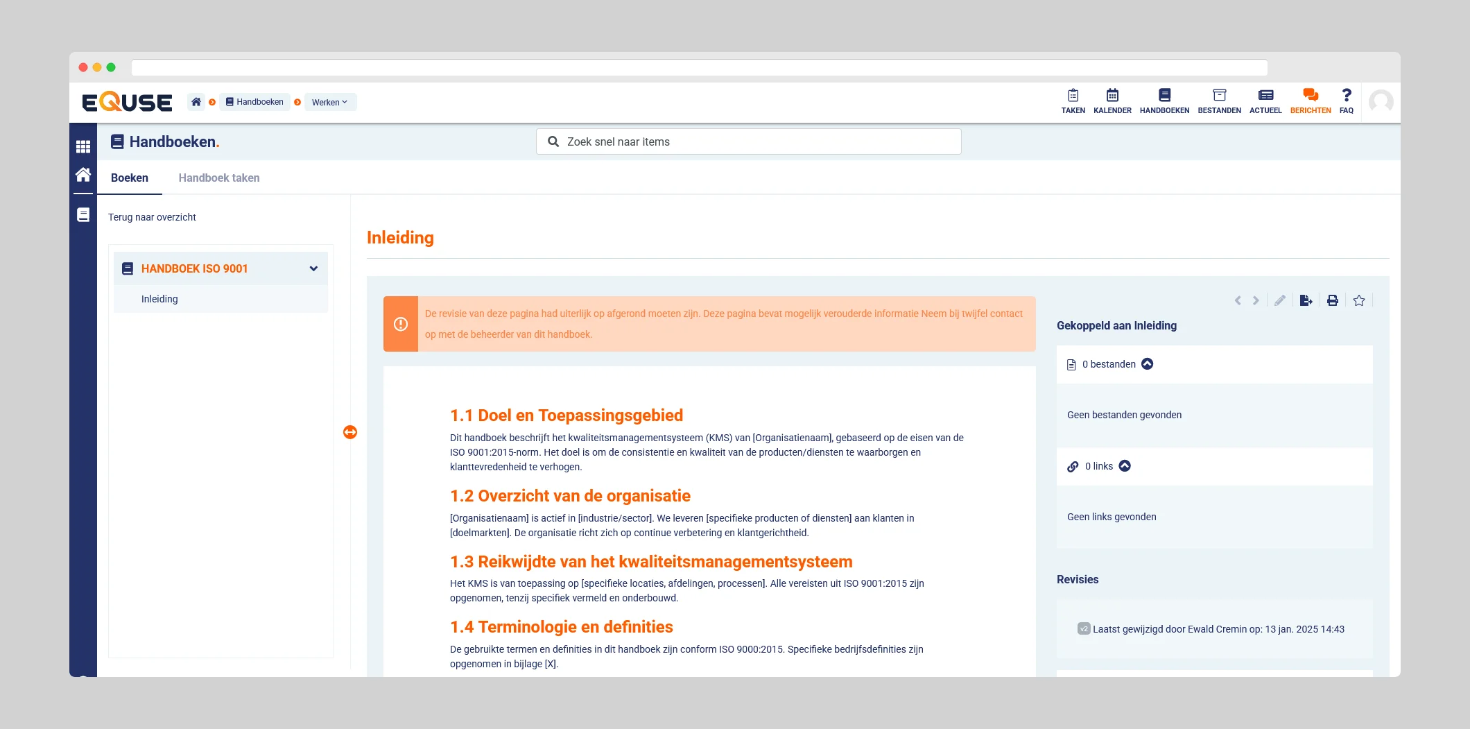 U ontvangt een waarschuwing boven de pagina wanneer de revisieplanning is verlopen. Deze melding attendeert u erop dat de pagina mogelijk verouderde content bevat, omdat deze op de ingestelde datum had moeten worden gereviseerd. Dit helpt u om aandacht te besteden aan mogelijk verouderde informatie.