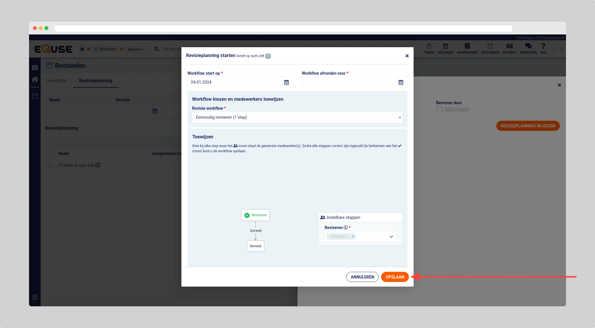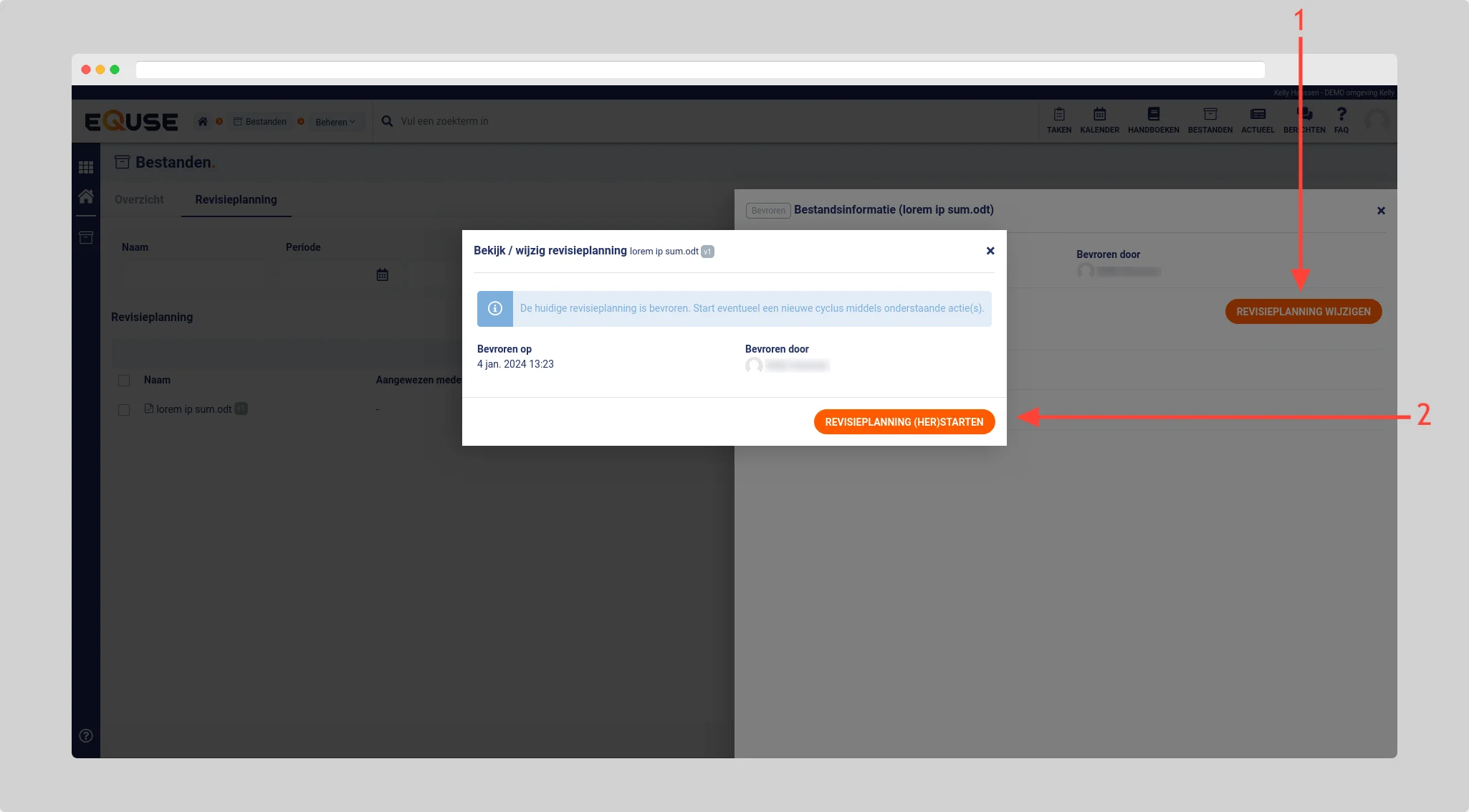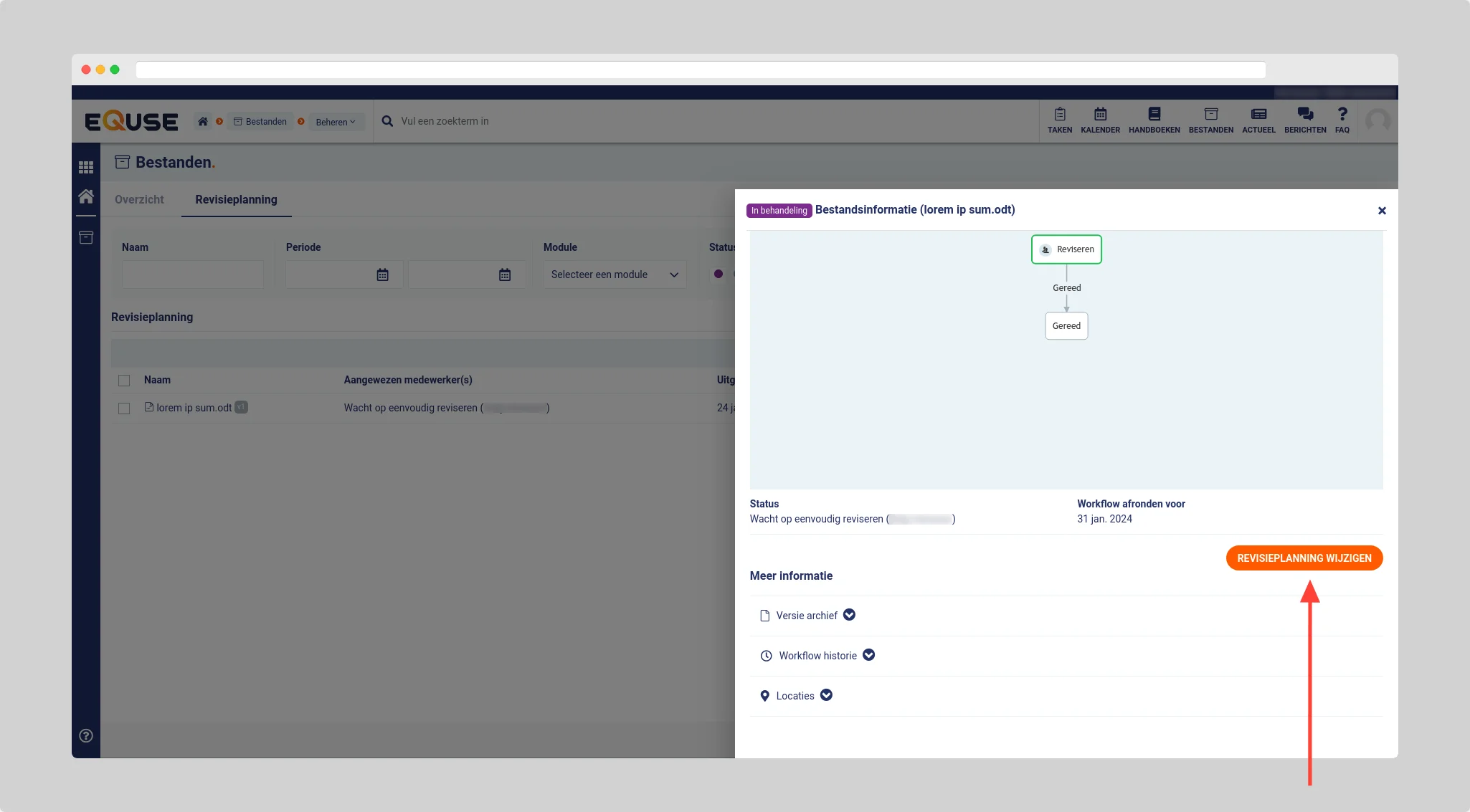 Klik op het document waarvoor u de revisieworkflow wilt omzetten en klik in het zijpaneel voor revisieplanning wijzigen.