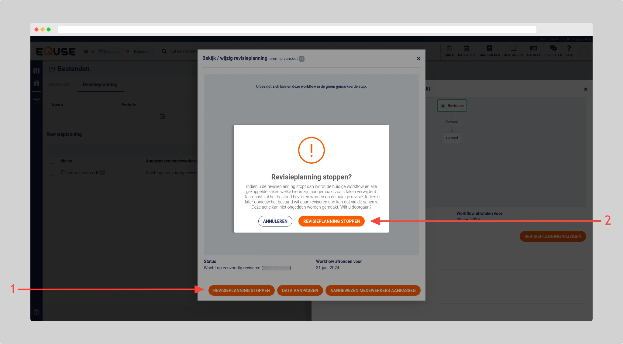 Klik in het verschijnende scherm op de knop Revisieplanning stoppen om alle taken en de workflow te verwijderen en de revisie te bevriezen.