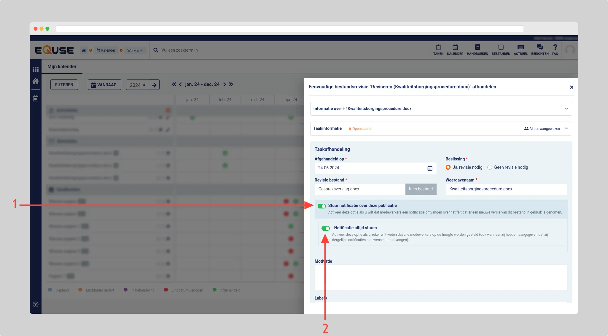 Bij de publicatie van een nieuwe bestandsrevisie, heeft u de mogelijkheid om medewerkers een notificatie te laten ontvangen over het feit dat er een nieuwe versie van dit bestand in gebruik is genomen (1). Als u zeker wilt weten dat alle medewerkers op de hoogte worden gesteld (ook wanneer zij hebben aangegeven dat zij dergelijke notificaties niet wensen te ontvangen), dan kunt u er voor kiezen om de notificatie altijd te sturen (2).