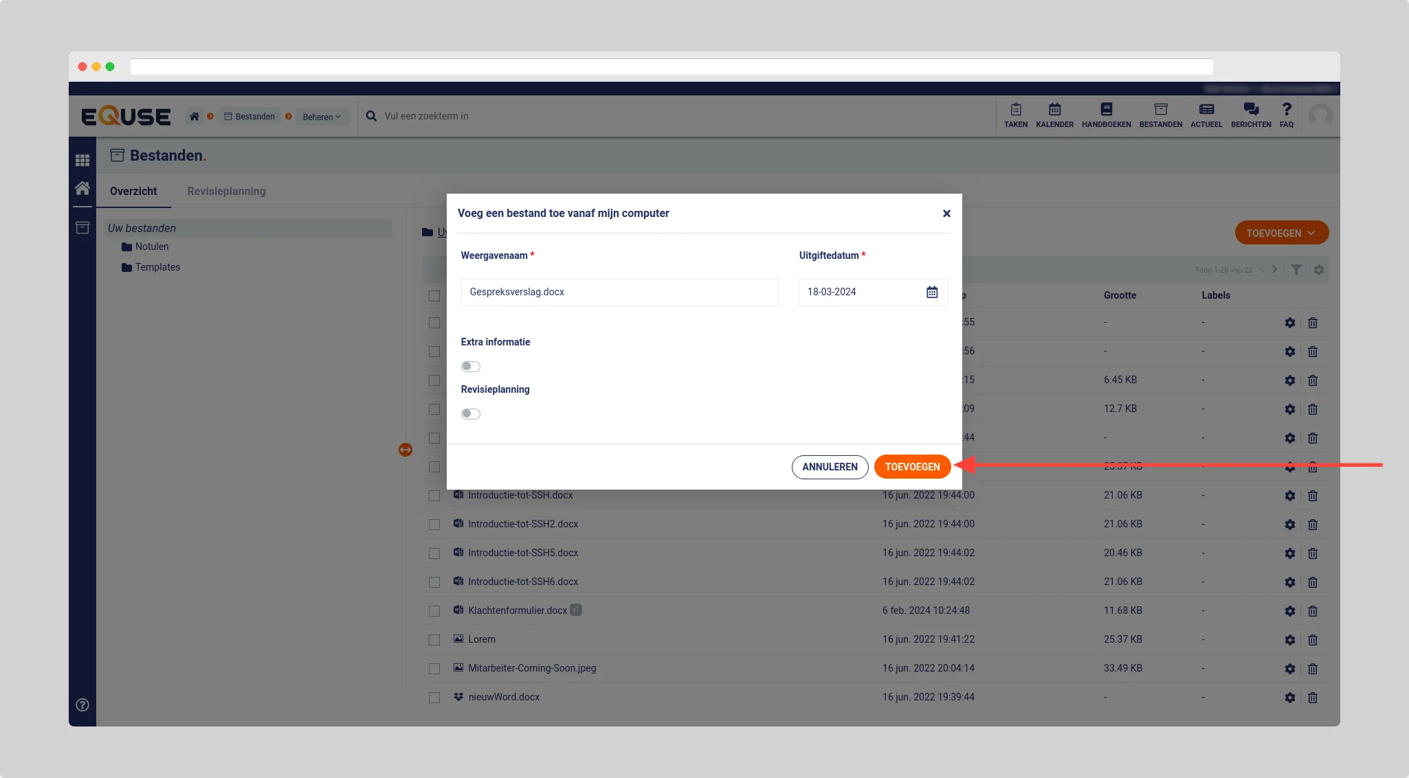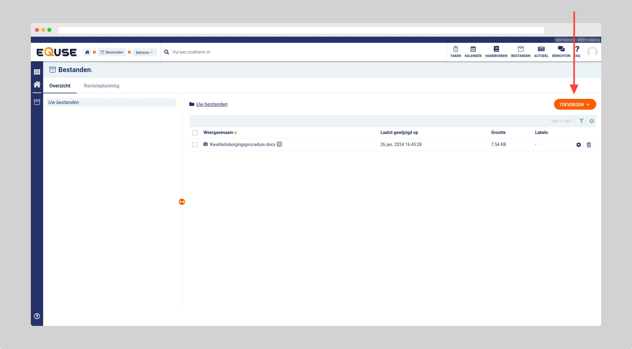 Selecteer vervolgens het bestand op uw computer dat u naar eQuse wilt uploaden. Vul de algemene bestandsgegevens in en/of revisieplanning (optioneel) en klik daarna op de knop toevoegen.
