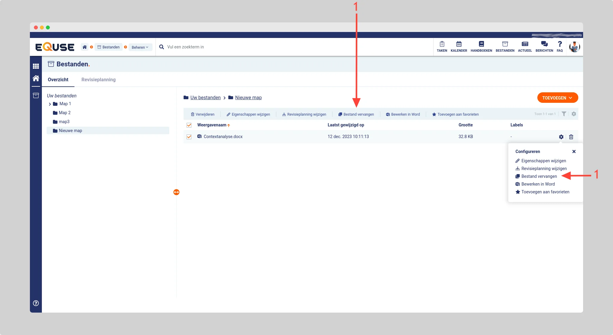 Om een oud bestand te vervangen door een nieuw bestand, gaat u naar Bestanden > Beheren > Overzicht. Selecteer (of klik op het tandwiel icoontje) het bestand dat u wilt vervangen en klik vervolgens op Bestand vervangen (1).