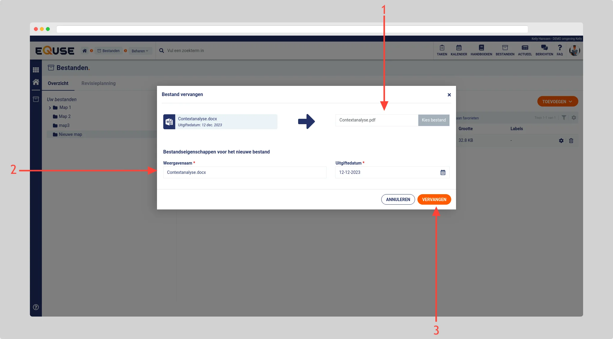 Selecteer vervolgens het nieuwe bestand (1), wijzig eventueel de bestandseigenschappen (2) en klik daarna op de knop vervangen (3) om het bestand te vervangen.