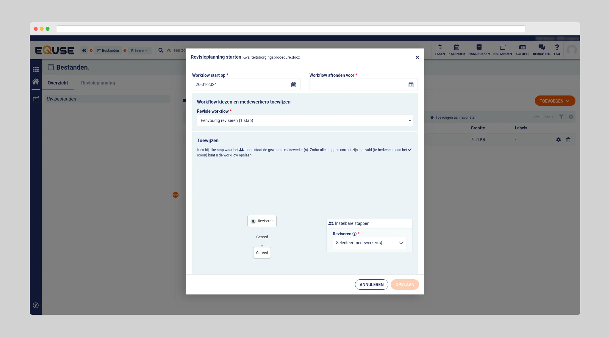 Vul de datums in waarop de workflow start en afgerond moet zijn, selecteer de gewenste workflow en wijs een verantwoordelijke medewerker toe bij iedere stap binnen de geselecteerde workflow. Zodra alle stappen ingevuld zijn klikt u op de knop opslaan om de wijzigingen op te slaan en de revisieplanning te starten.
