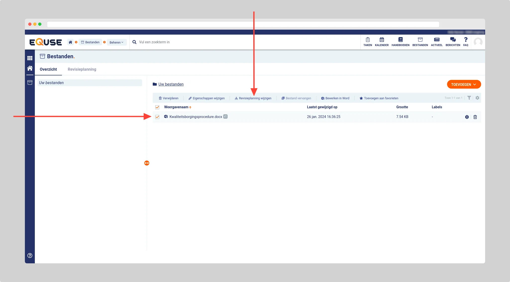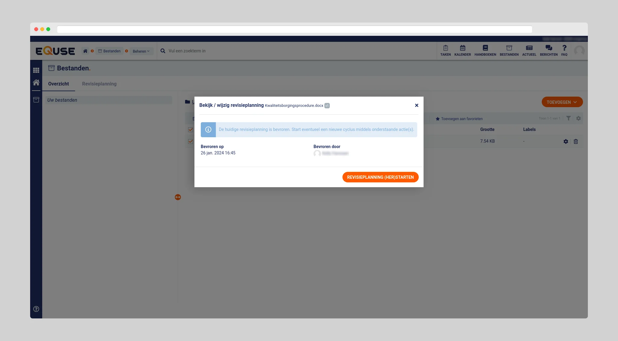 Ga naar Bestanden > Beheren > Overzicht en selecteer het bestand waarvoor u de revisieplanning wilt herstarten door op het selectievakje te klikken en klik op revisieplanning wijzigen