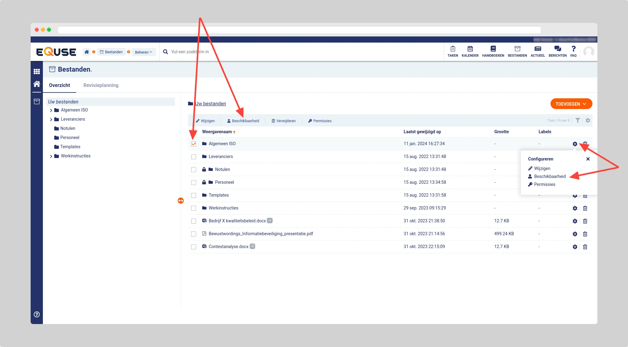 Ga naar Bestanden > Beheren > Overzicht. Selecteer de map waarvoor u de beschikbaarheid wilt instellen door deze te selecteren, of door op het tandwiel icoon te klikken, en klik op beschikbaarheid.