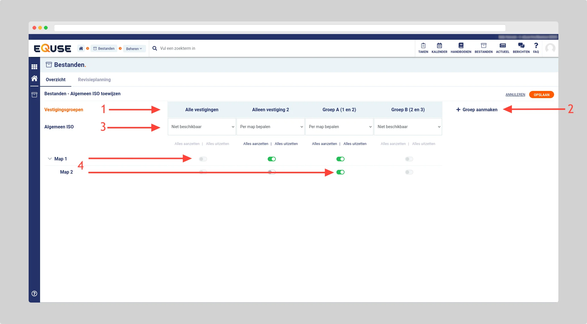 U kunt nu de beschikbaarheid gaan instellen. In het overzicht ziet u uw vestigingsgroepen (1) en heeft u de mogelijkheid om eventueel direct een nieuwe vestigingsgroep toe te voegen (2). Op de regel direct daaronder ziet u de naam van de hoofdmap (3) en kunt u voor iedere vestigingsgroep kiezen of er voor deze vestigingsgroep mappen beschikbaar kunnen worden gesteld (dit staat standaard op niet beschikbaar ingesteld). Kies voor de instelling per map bepalen waarna u de mogelijkheid heeft om door middel van het schuifje, per sub-map (4) te bepalen of deze beschikbaar is voor deze vestigingsgroep (u kunt dit eventueel vereenvoudigen door op de linkjes alles aanzetten en alles uitzetten te klikken).