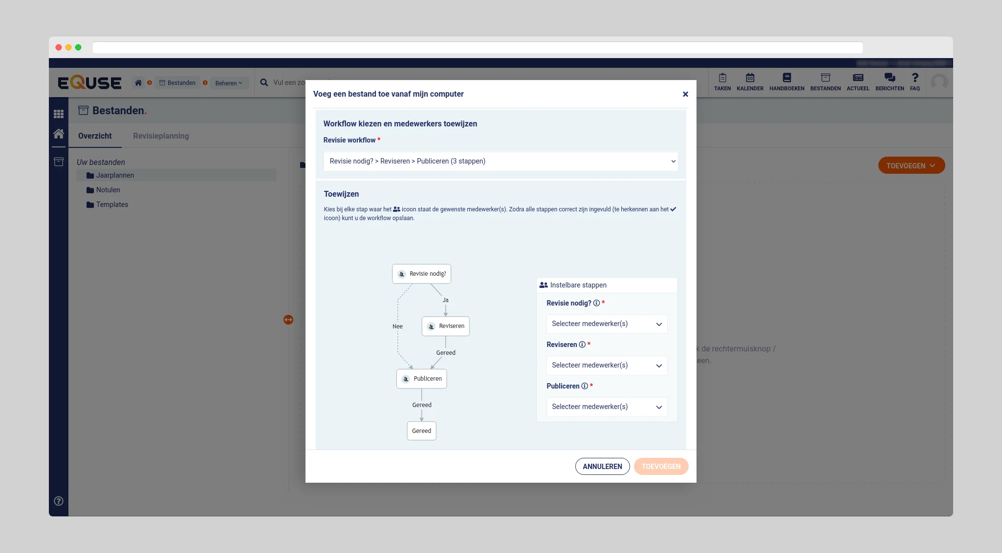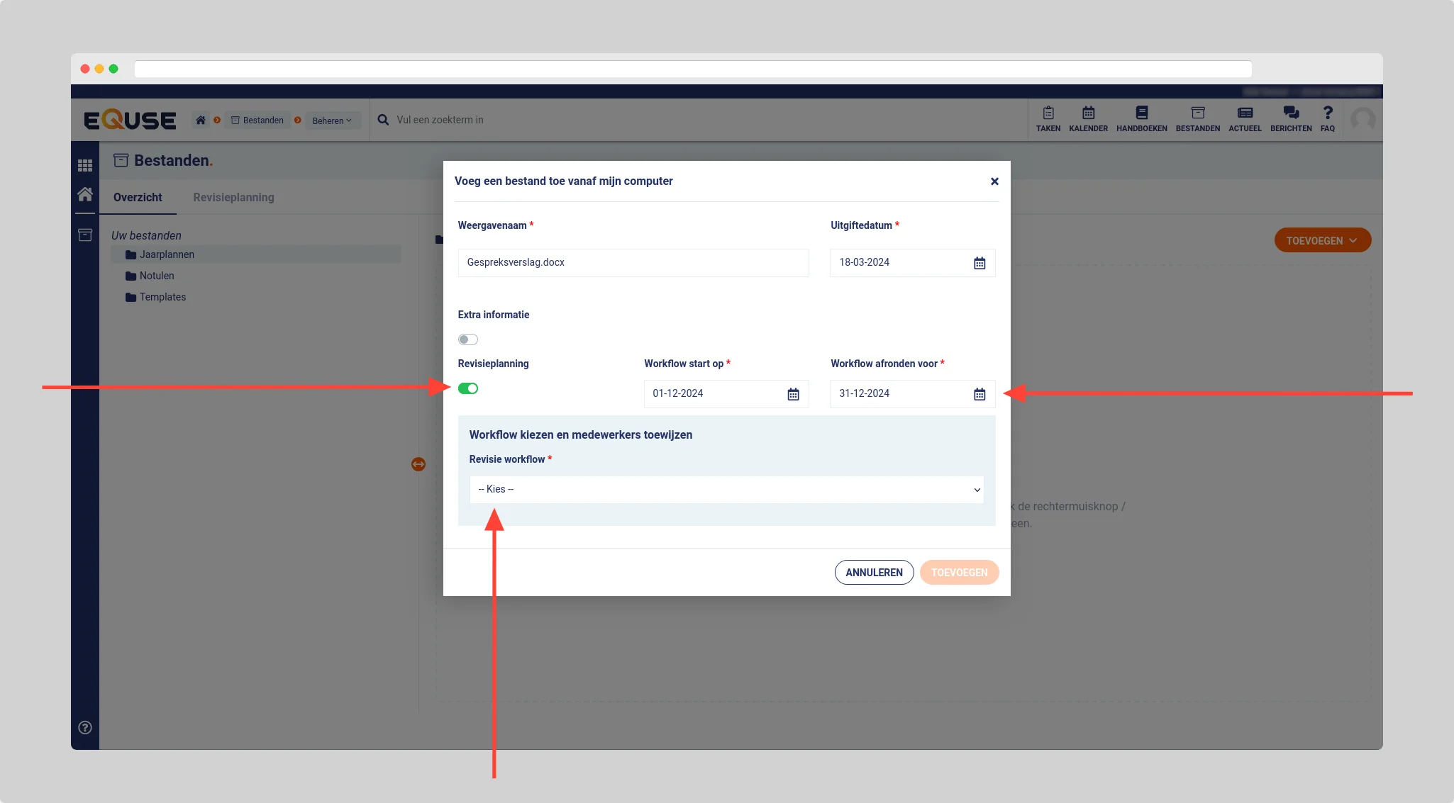 Zet het schuifje bij "Revisieplanning" aan. Vul de datum in waarop de revisieplanning moet starten, en de datum wanneer deze afgerond moet zijn en selecteer de gewenste workflow. Klik daarna op de knop toevoegen om het bestand toe te voegen.