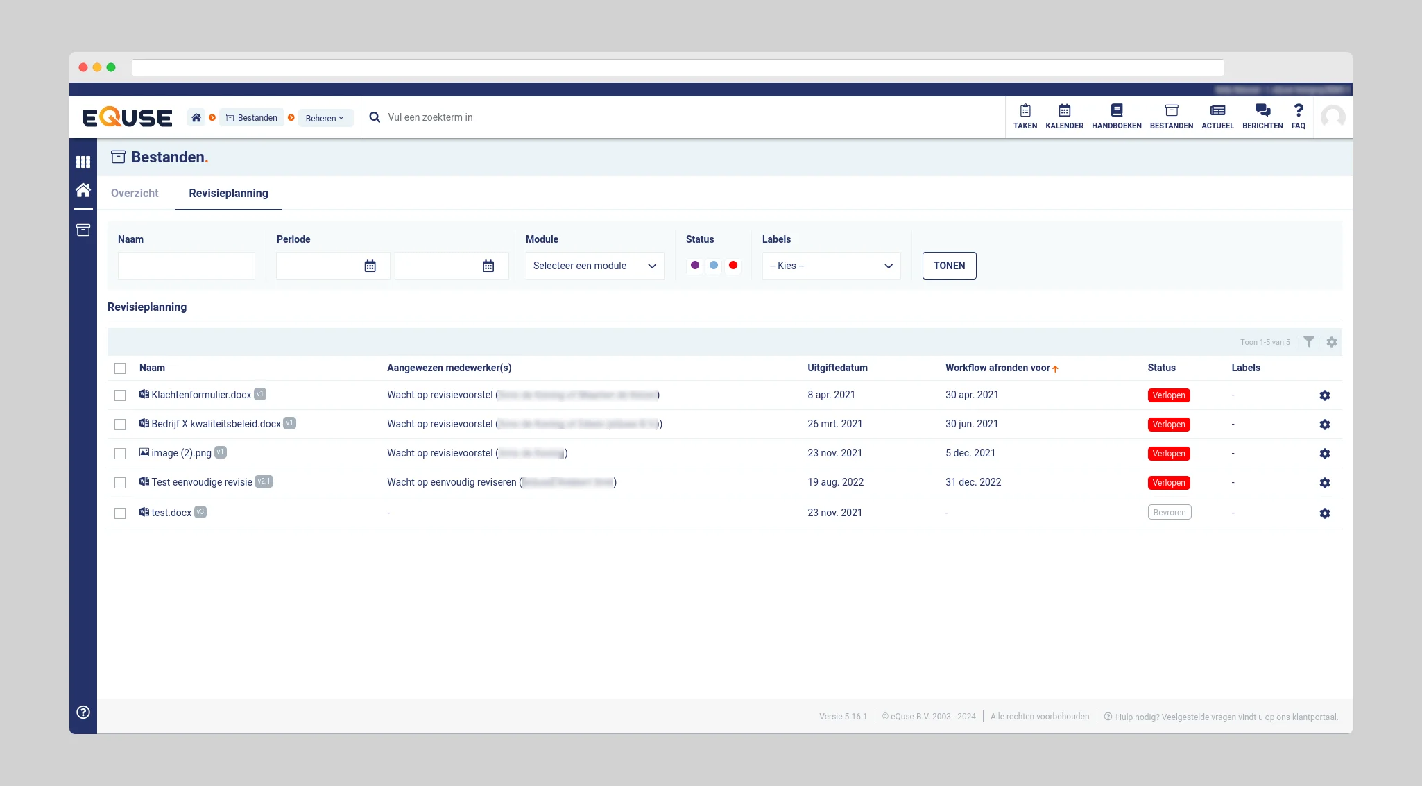 U kunt een statusoverzicht bekijken van bestanden met revisieplanning via Bestanden > Beheren > Revisieplanning.