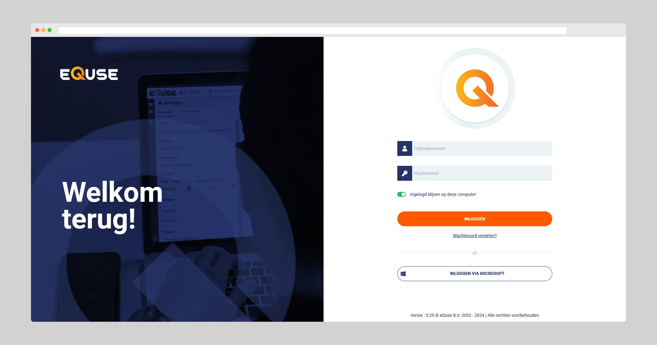 U kunt inloggen in het systeem via start.equse.nl. Hiervoor gebruikt u uw gebruikersnaam en wachtwoord of, indien ingesteld, uw Microsoft account via Single Sign-On.