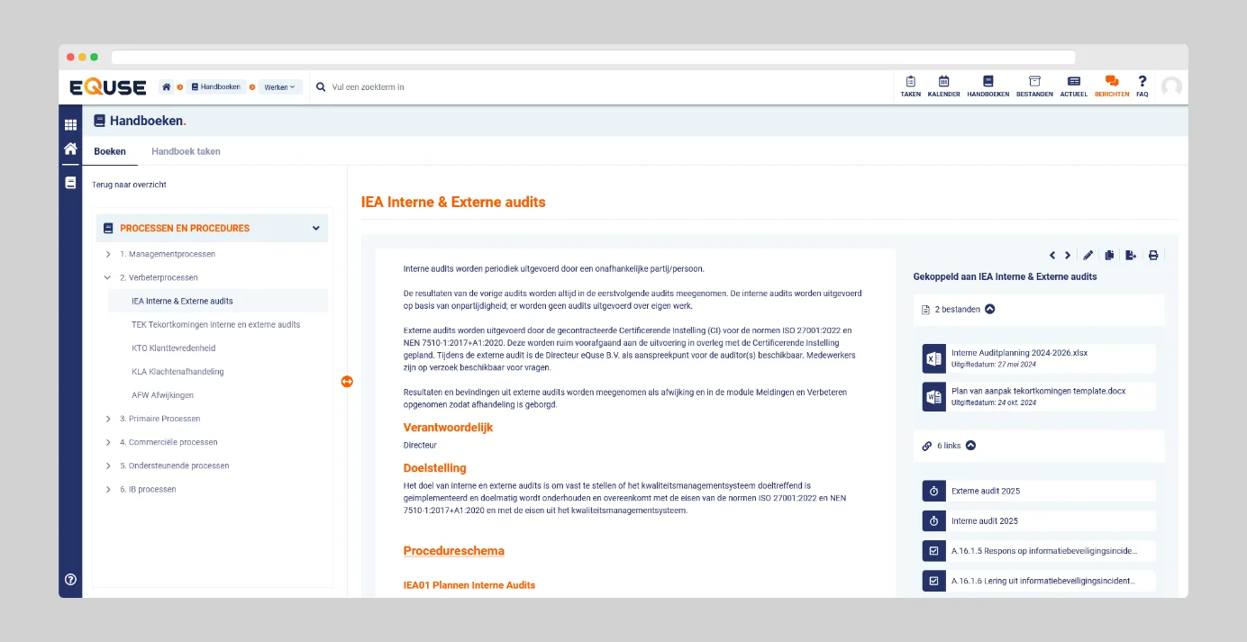 Het lezen en raadplegen van documentatie in eQuse is essentieel voor het naleven van werkinstructies en het ondersteunen van uw dagelijkse taken. De beschikbare documentatie stelt u in staat veilig en efficiënt te werken volgens de vastgestelde procedures. Afhankelijk van hoe de beheerder het systeem heeft ingericht, kan documentatie beschikbaar zijn via de module Bestanden en/of Handboeken.