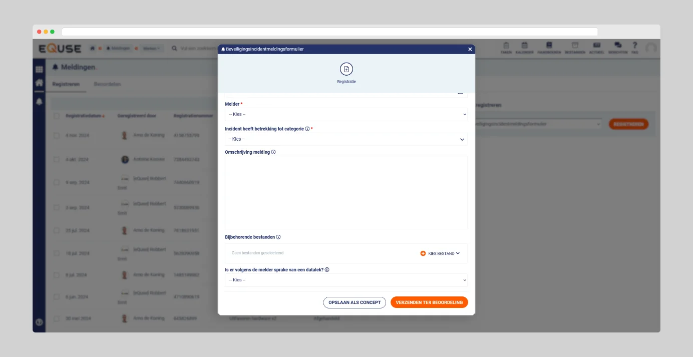 Het registreren van informatie in eQuse is essentieel om kwaliteit en veiligheid binnen uw organisatie te waarborgen. Door gegevens zoals incidenten, klachten en prestaties nauwkeurig vast te leggen, krijgt u inzicht in processen en mogelijkheden voor verbetering. eQuse biedt meerdere modules waarmee u eenvoudig en efficiënt informatie kunt registreren.