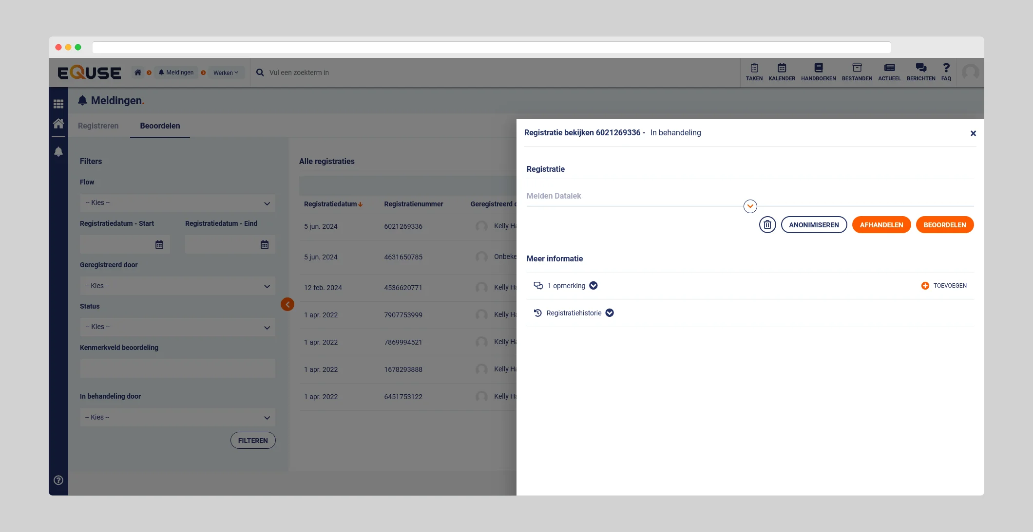 Door een registratie in het overzicht aan te klikken, kunt u de registratie verwijderen of anonimiseren. Bij anonimisering kunnen persoonlijke gegevens uit de registratie worden verwijderd, zodat deze niet langer herleidbaar is. Daarnaast biedt eQuse de mogelijkheid om opmerkingen en bestanden toe te voegen aan registraties, zoals een gespreksverslag. Dit maakt het eenvoudig om een volledig dossier op te bouwen rondom een specifieke registratie.