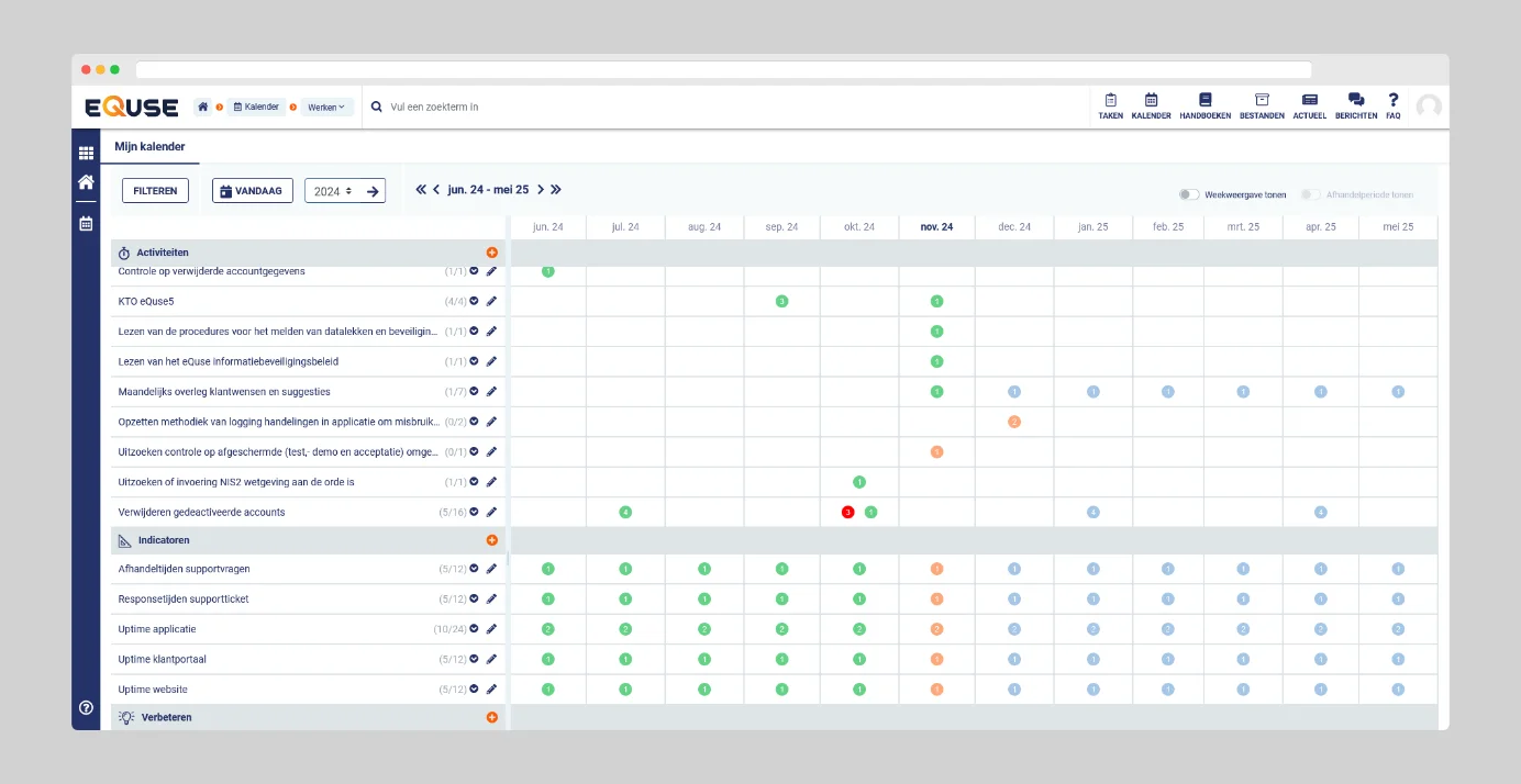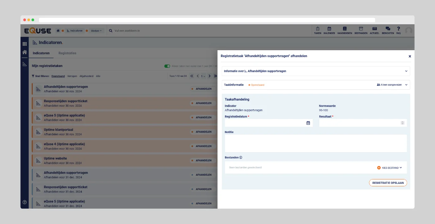 De module Indicatoren in eQuse stelt u in staat om prestatie-indicatoren gestructureerd vast te leggen. De module is ontworpen om u te helpen resultaten overzichtelijk vast te leggen en te volgen, waardoor u inzicht krijgt in belangrijke processen binnen uw organisatie.