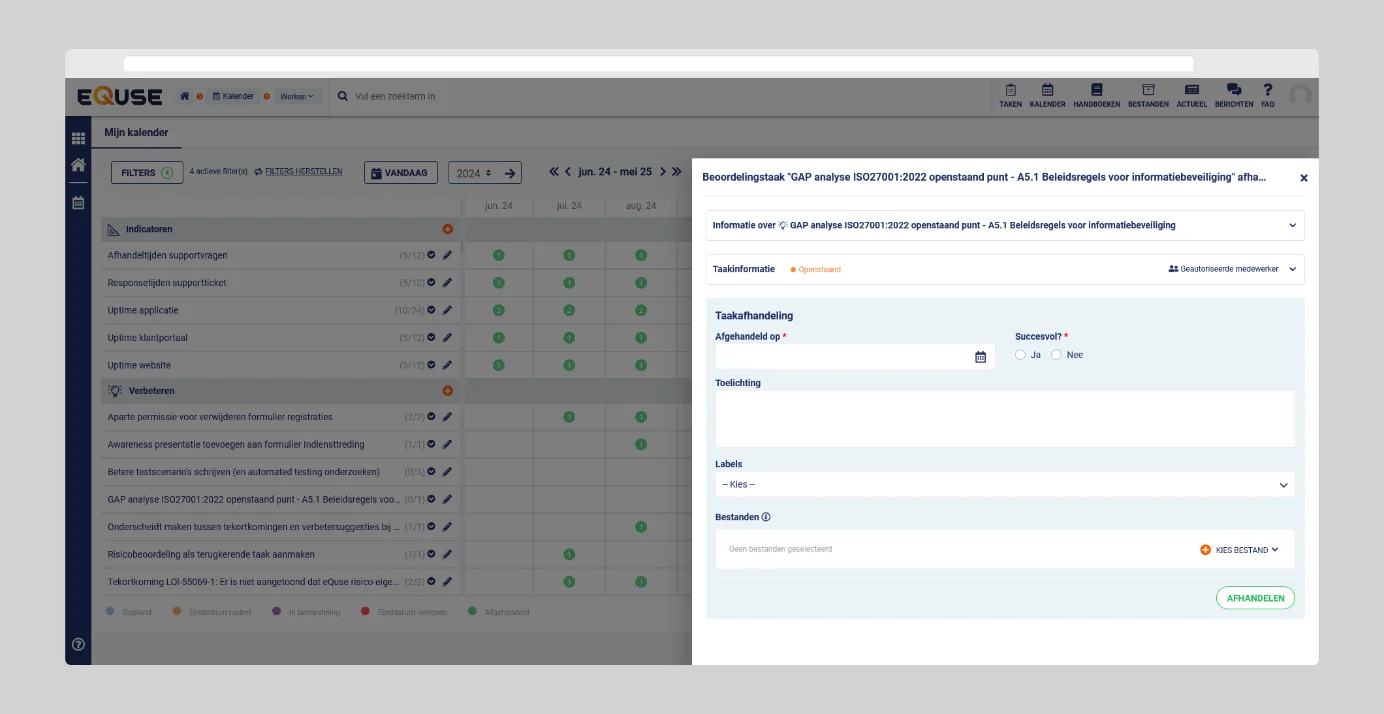 Het efficiënt afhandelen van toegewezen taken is een belangrijk onderdeel van uw werk binnen eQuse. Met verschillende functies biedt het systeem een overzicht van uw taken en maakt het afhandelen daarvan eenvoudig en gestructureerd.