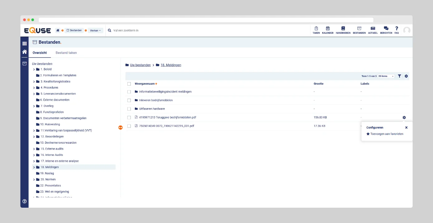 Documenten bekijken en downloaden: eQuse biedt voorvertoningen van ondersteunde bestanden, zodat u ze direct in het systeem kunt bekijken *. Daarnaast kunt u documenten downloaden voor offline gebruik. Bij documenten en handboekpagina’s met versiebeheer wordt het versienummer naast de titel weergegeven, zodat u altijd met de juiste versie werkt.