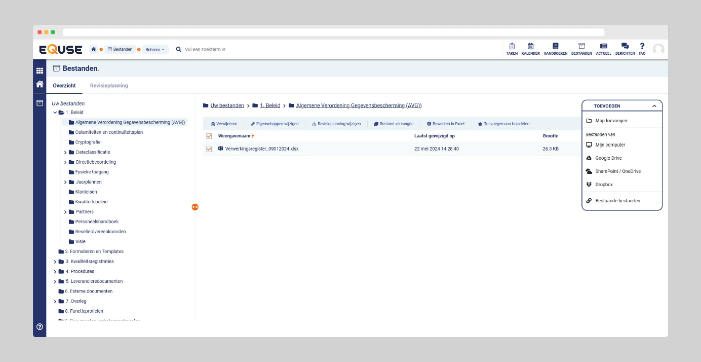 U kunt documenten en mappen beheren door nieuwe mappen aan te maken. Hiermee behoudt u een overzichtelijke en logische structuur binnen uw documentatie. U kunt bestanden rechtstreeks uploaden vanaf uw computer. Voor bestanden uit cloudopslagservices zoals Google Drive, SharePoint/OneDrive en Dropbox wordt alleen een link naar het bestand gelegd, zodat het document niet rechtstreeks in eQuse wordt opgeslagen. Daarnaast kunt u bestanden die al in het systeem aanwezig zijn opnieuw koppelen aan andere mappen, wat duplicatie voorkomt en de organisatie efficiënter maakt.