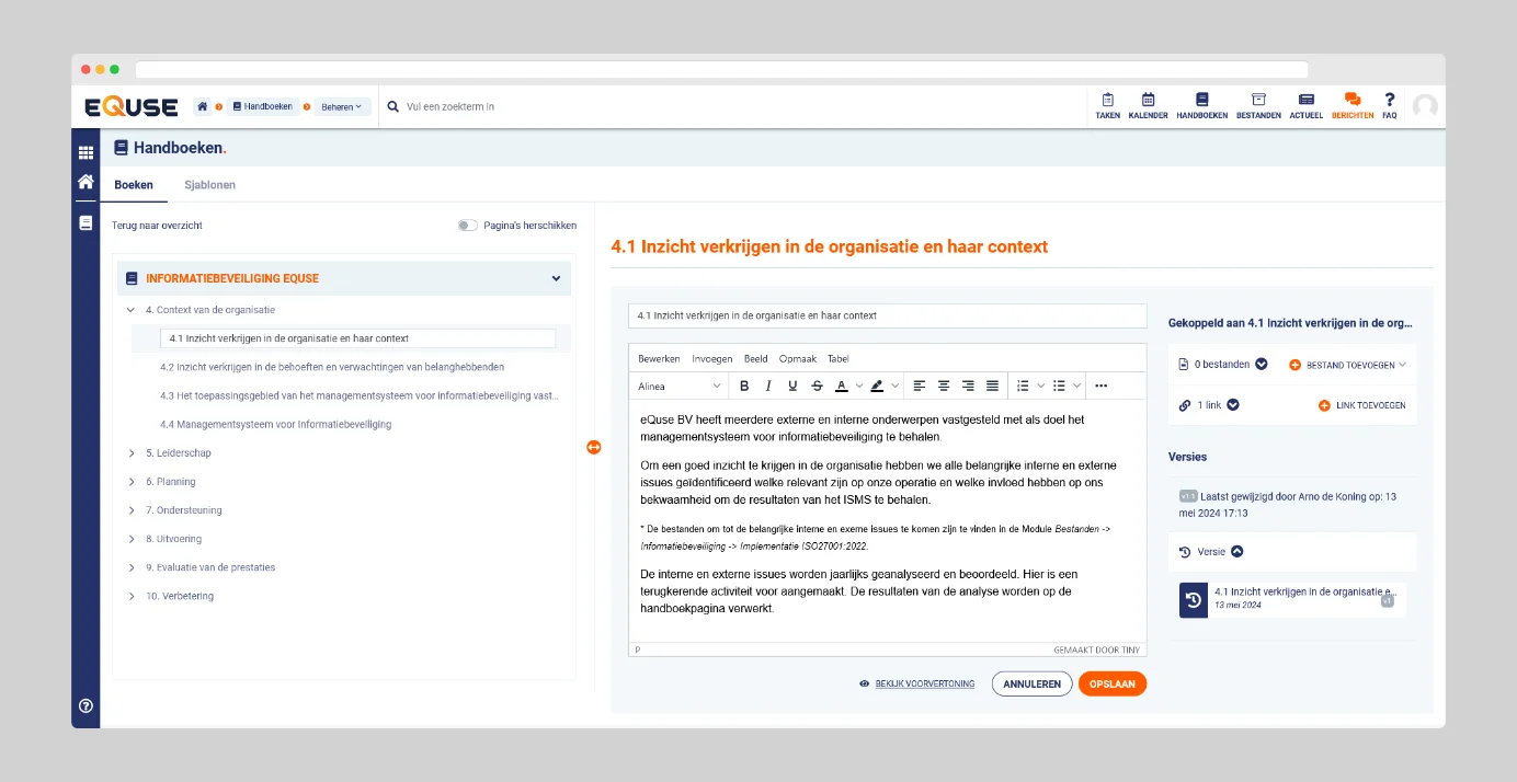 eQuse biedt beheerders de tools om handboeken op een overzichtelijke en efficiënte manier te beheren. Hiermee kunt u handboeken structureren, bijwerken en uitbreiden, zodat ze volledig aansluiten bij de processen en informatiebehoeften van uw organisatie.