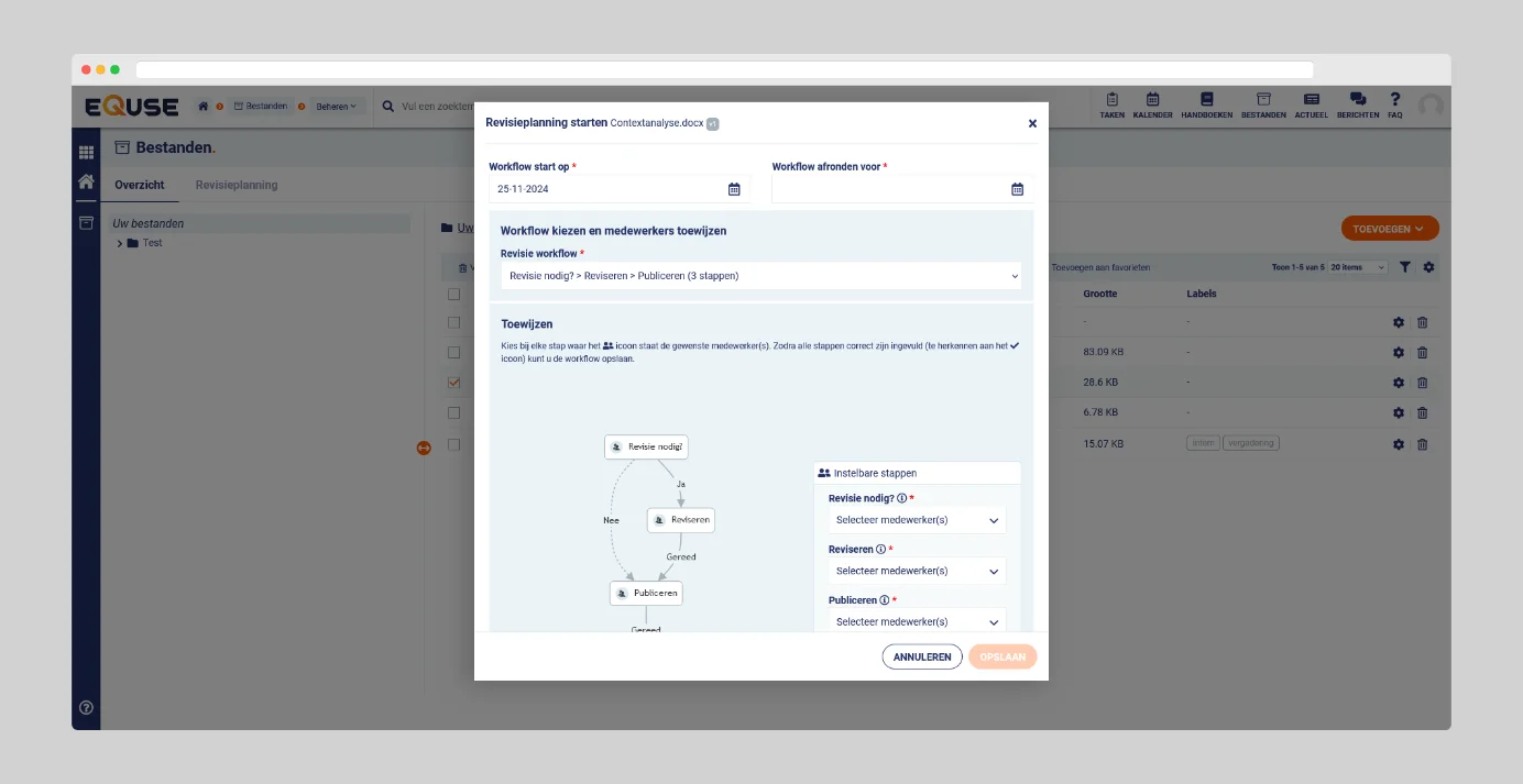Revisieplanning is een belangrijke functionaliteit binnen eQuse. Het helpt u bestanden en handboeken systematisch te evalueren en bij te werken, zodat de informatie up-to-date blijft en voldoet aan kwaliteitsstandaarden. In beide modules kunt u start- en einddatums voor revisies definiëren, een workflow selecteren en verantwoordelijkheden toewijzen aan medewerkers.