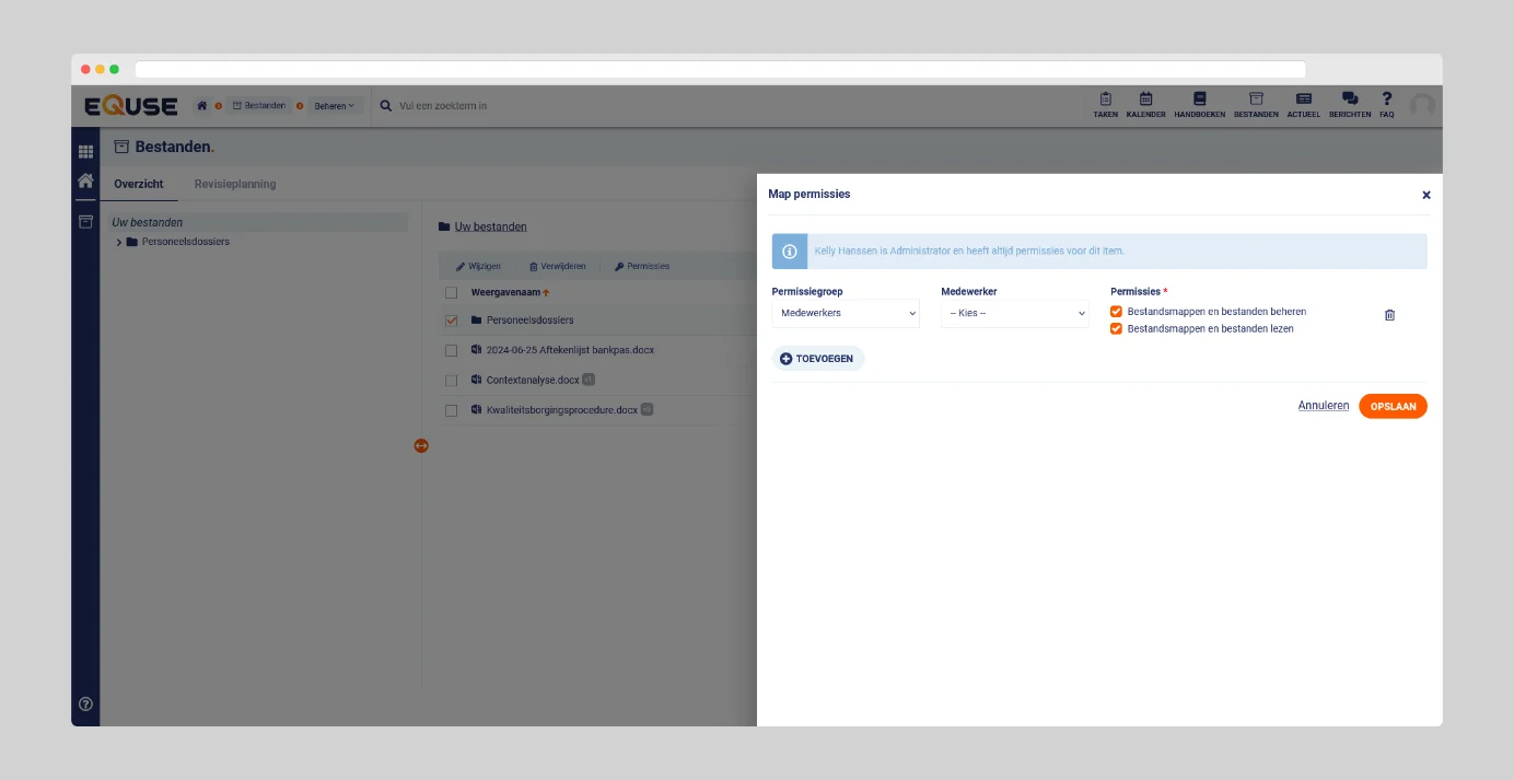Permissies op objectniveau bieden beheerders de mogelijkheid om toegang te beperken tot specifieke onderdelen binnen EQUSE, zoals handboeken of bestandsmappen. Hiermee kan worden bepaald welke medewerkers toegang hebben en welke acties zij mogen uitvoeren, zoals lezen of beheren. Dit biedt een verfijnd niveau van controle over de toegankelijkheid van gevoelige of belangrijke informatie.