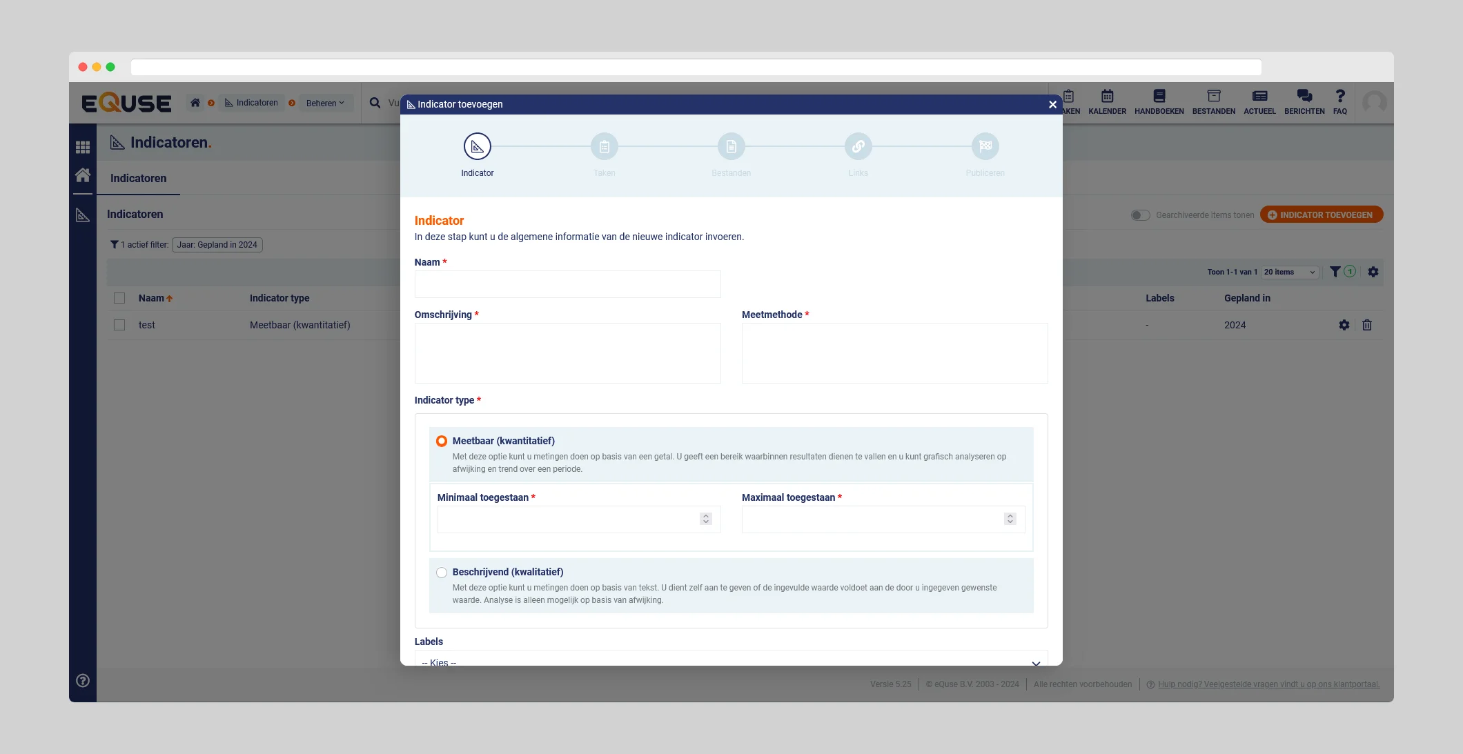 Het beheren van prestatie-indicatoren in eQuse gebeurt via de werkomgeving Beheren van de module Indicatoren. Hier kunt u nieuwe indicatoren toevoegen, bestaande aanpassen en resultaten analyseren.