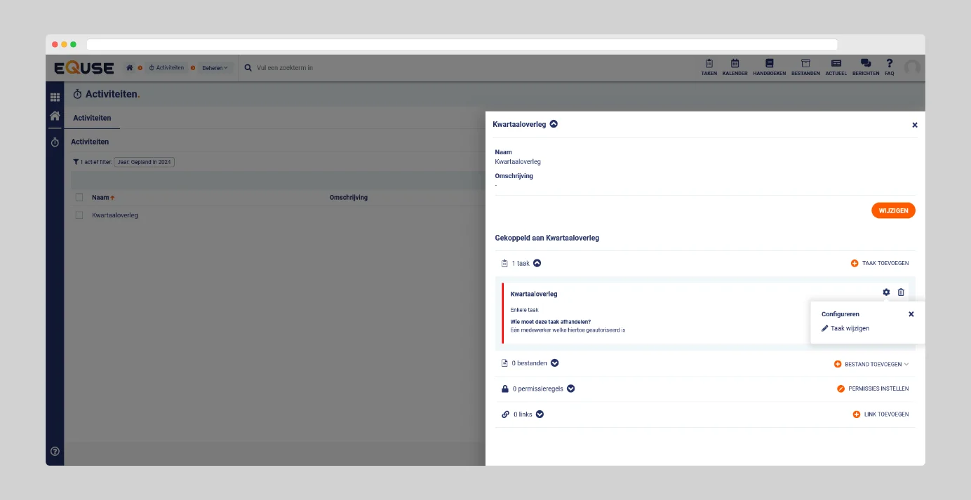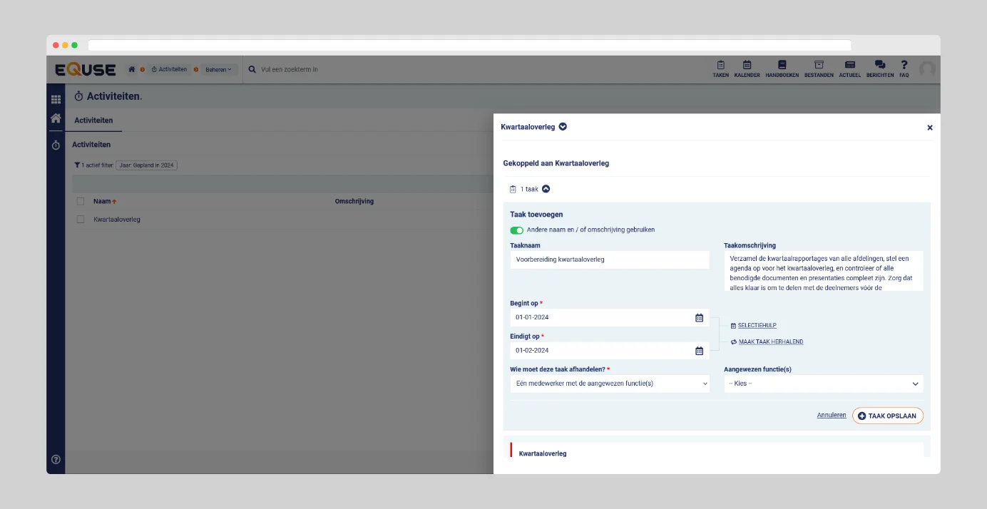 Taken in eQuse kunnen voortkomen uit verschillende modules, zoals Activiteiten, Onderhoud, Verbeteren, Indicatoren, Formulieren, of de revisieplanning, en werken altijd op dezelfde manier. De naam en omschrijving van een taak kunnen worden aangepast, zodat u de taak duidelijker en specifieker kunt maken, bijvoorbeeld om beter aan te sluiten bij de inhoud of context van de taak.