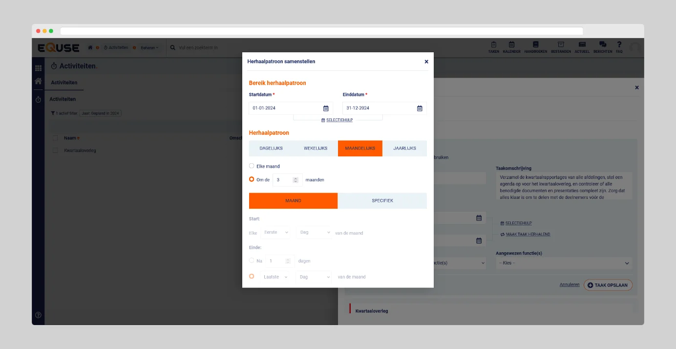 In eQuse kunt u taken instellen met een herhaalpatroon voor periodieke activiteiten. Bij het toevoegen van een taak kiest u de optie “maak taak herhalend”, waarmee u een venster opent om het herhaalpatroon te definiëren. U kunt aangeven hoe vaak de taak moet worden herhaald, zoals dagelijks, wekelijks, maandelijks of jaarlijks, binnen de ingestelde periode.