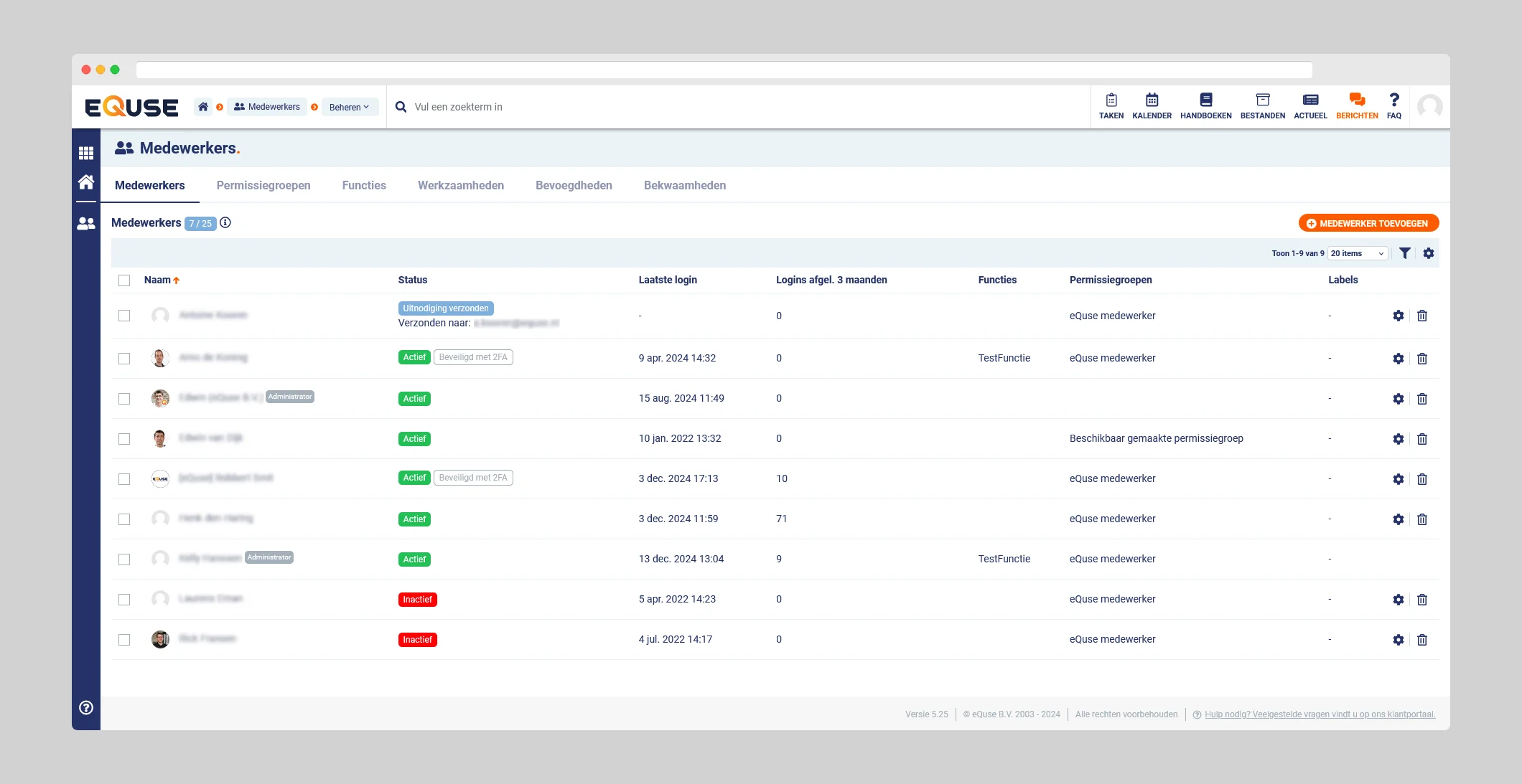Het standaard ingestelde limiet voor medewerkers met toegang tot eQuse is 25. Links bovenaan in het medewerkersoverzicht ziet u het aantal actieve medewerkers ten opzichte van het maximale limiet. Medewerkers met de status Inactief of Aangemaakt worden hierbij niet meegerekend. Als u meer medewerkers wilt toevoegen dan het huidige limiet toestaat, kunt u het limiet eenvoudig ophogen via de link naast het weergegeven maximum.
