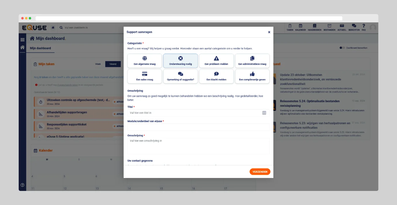 Als u aanvullende hulp nodig heeft, kunt u contact opnemen met de support desk via de vraagtekenknop onderaan de blauwe balk aan de linkerkant van het scherm. Via deze knop kunt u ondersteuning vragen bij specifieke problemen, algemene vragen stellen of een probleem melden. Heeft u een klacht, opmerking of suggestie? Wij horen dat graag, want uw feedback helpt ons om eQuse continu te verbeteren. Door ons toestemming te geven om uw account in te zien, kunnen we met u meekijken. Dit stelt ons vaak in staat om uw vragen sneller te beantwoorden of uw probleem op te lossen. We waarderen het ook altijd enorm als u uw tevredenheid met ons deelt!