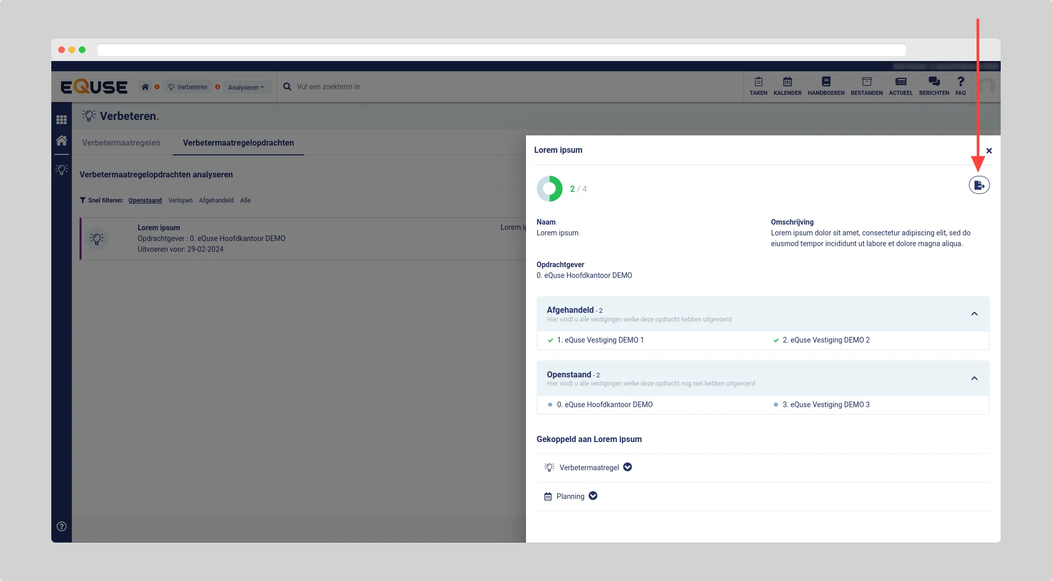 Ga naar Verbeteren > Analyseren > Verbetermaatregelopdrachten en klik op de verbetermaatregelopdracht waarvoor u de taakafhandelingen wilt exporteren.