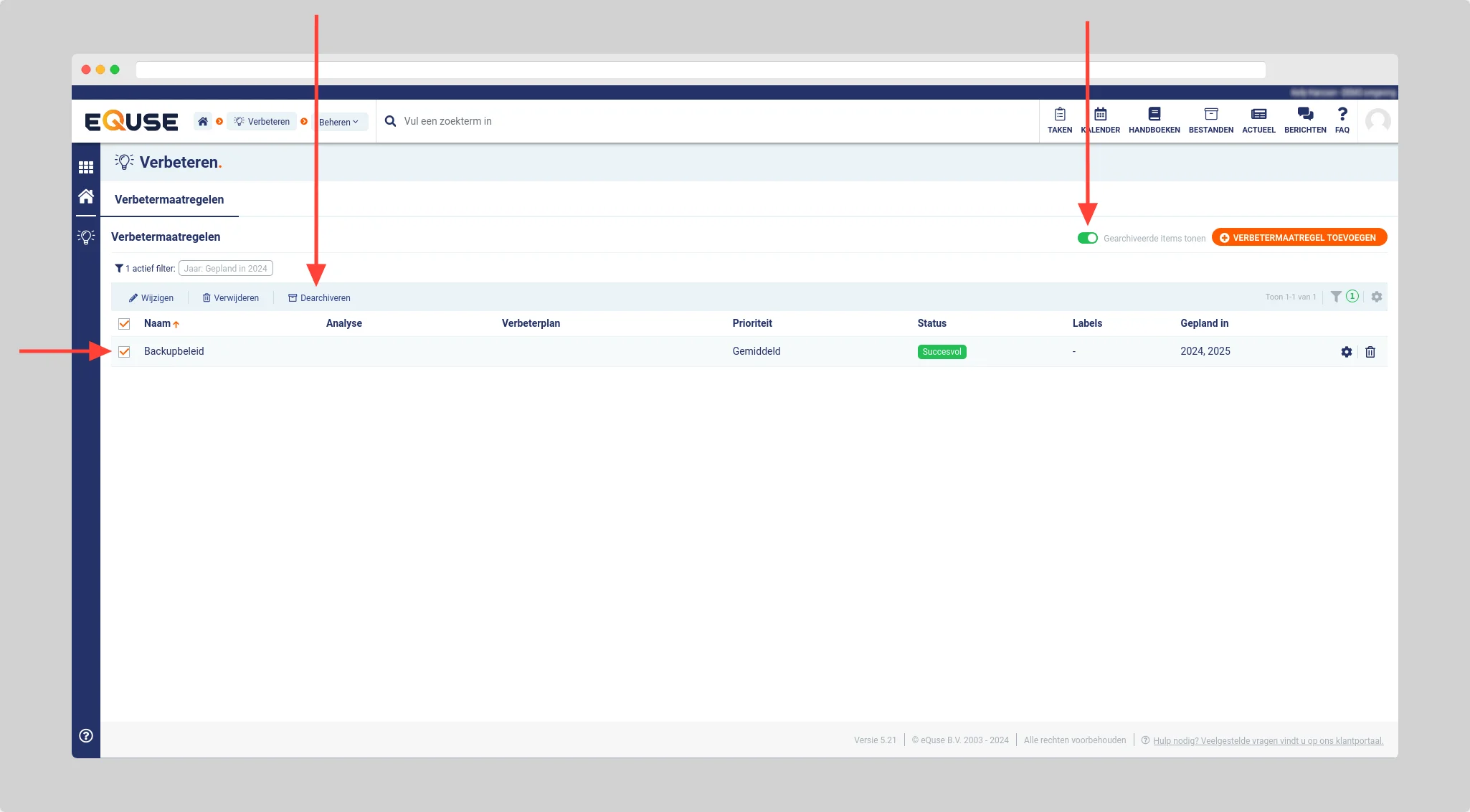 - Maak de gearchiveerde verbetermaatregelen zichtbaar door de schuiknop gearchiveerde items tonen te activeren.