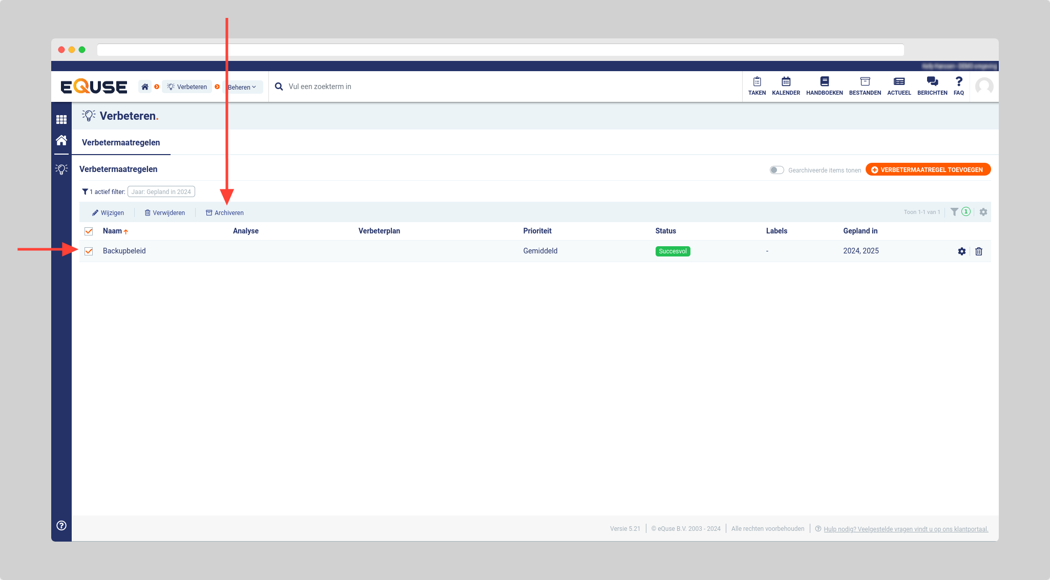 - Selecteer de verbetermaatregel die u wilt archiveren door het selectievakje aan te klikken en klik bovenaan de lijstweergave op archiveren.