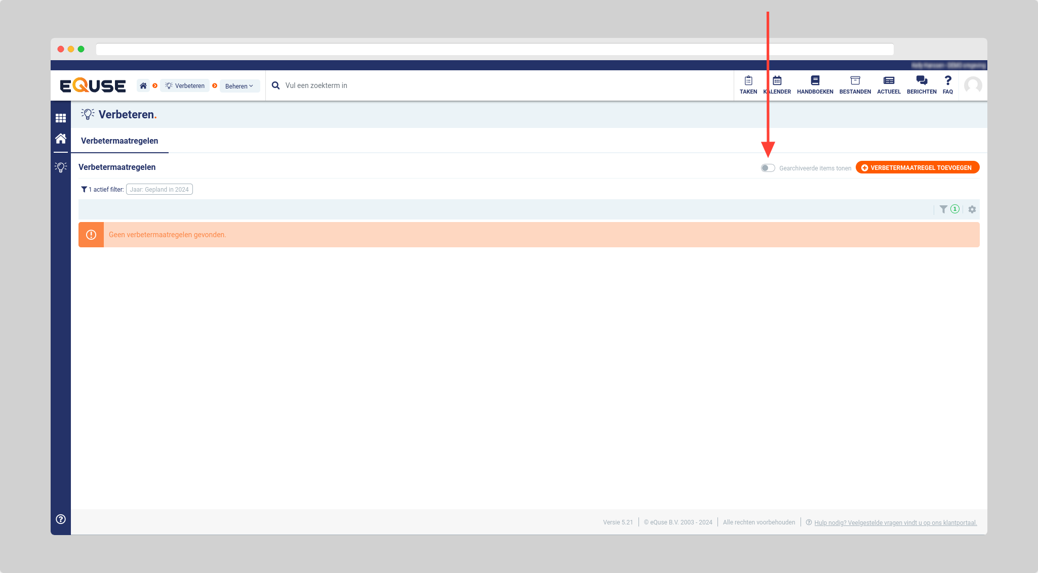 - De verbetermaatregel is nu verborgen in het overzicht van verbetermaatregelen. Activeer de instelling gearchiveerde items tonen om de gearchiveerde verbetermaatregel zichtbaar te maken.