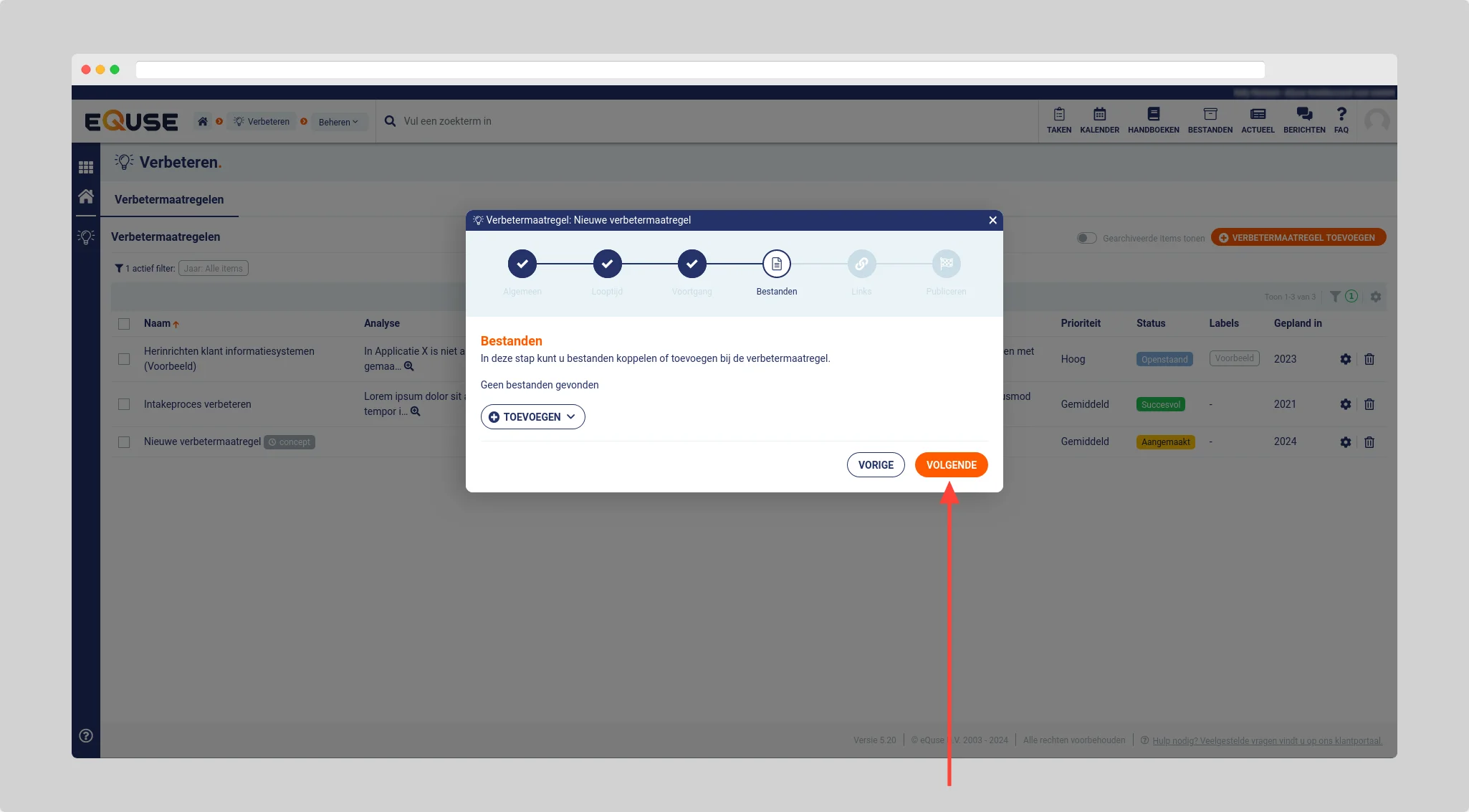 - Koppel eventueel bestanden of voeg nieuwe bestanden toe en klik op volgende.