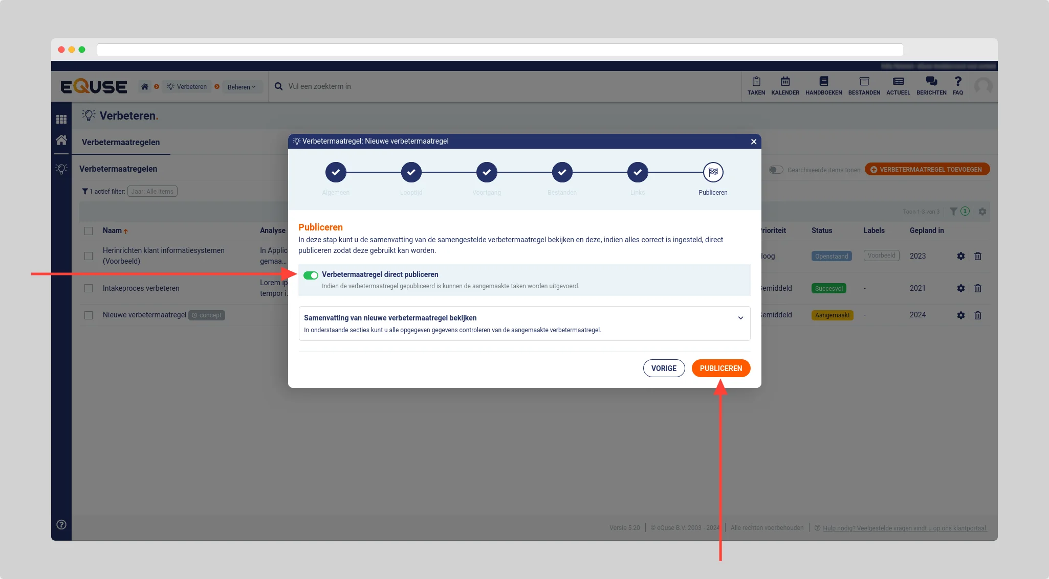 - Activeer de optie verbetermaatregel direct publiceren wanneer u de verbetermaatregel direct beschikbaar wilt maken.