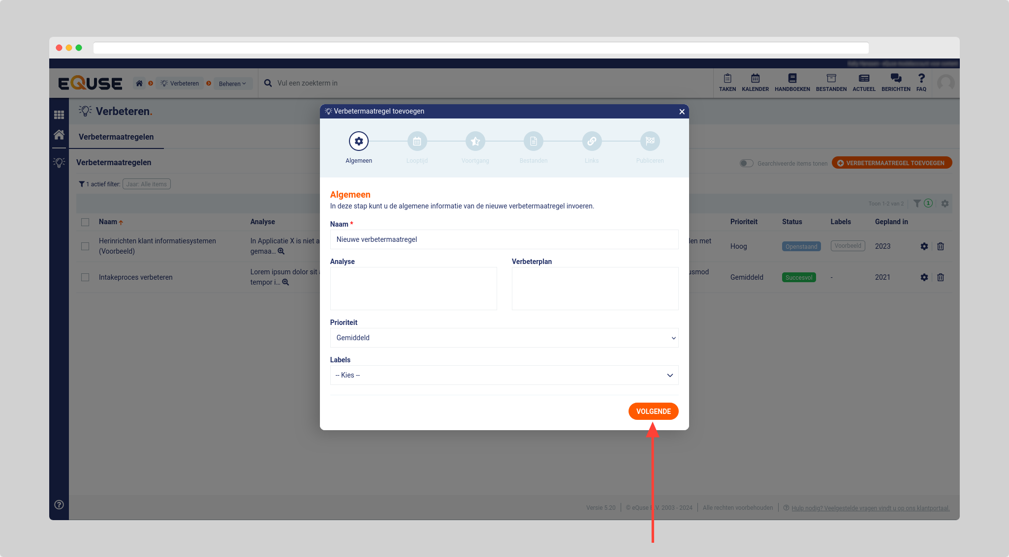 - Vul de algemene informatie van de nieuwe verbetermaatregel in en klik op volgende.