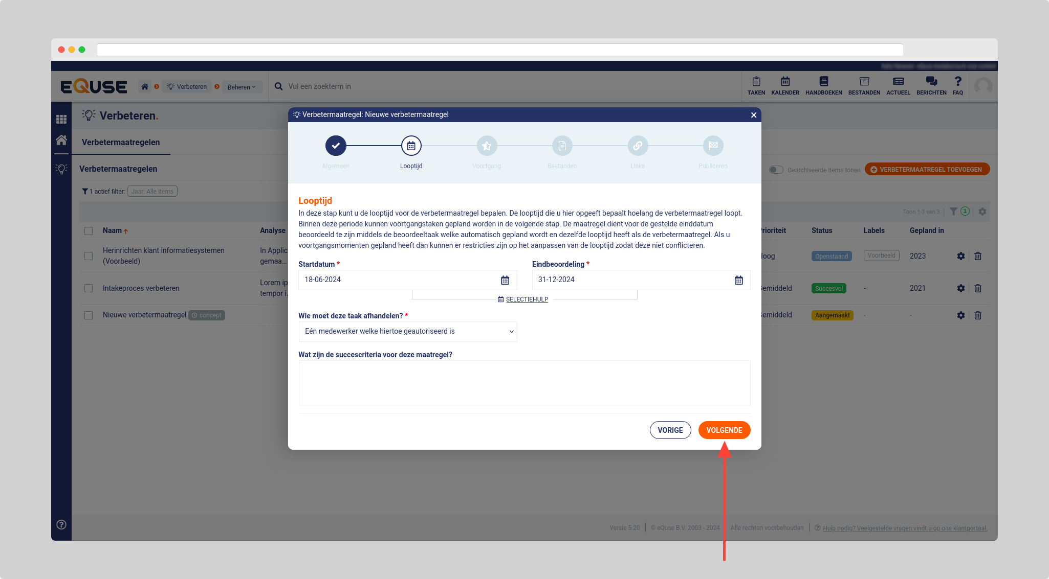 - Bepaal de looptijd voor de verbetermaatregel en klik op volgende.