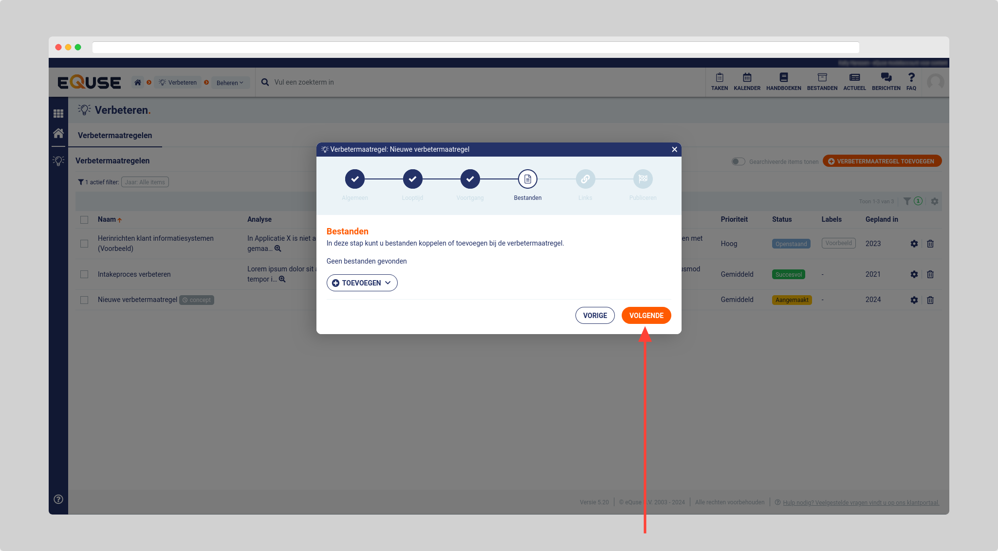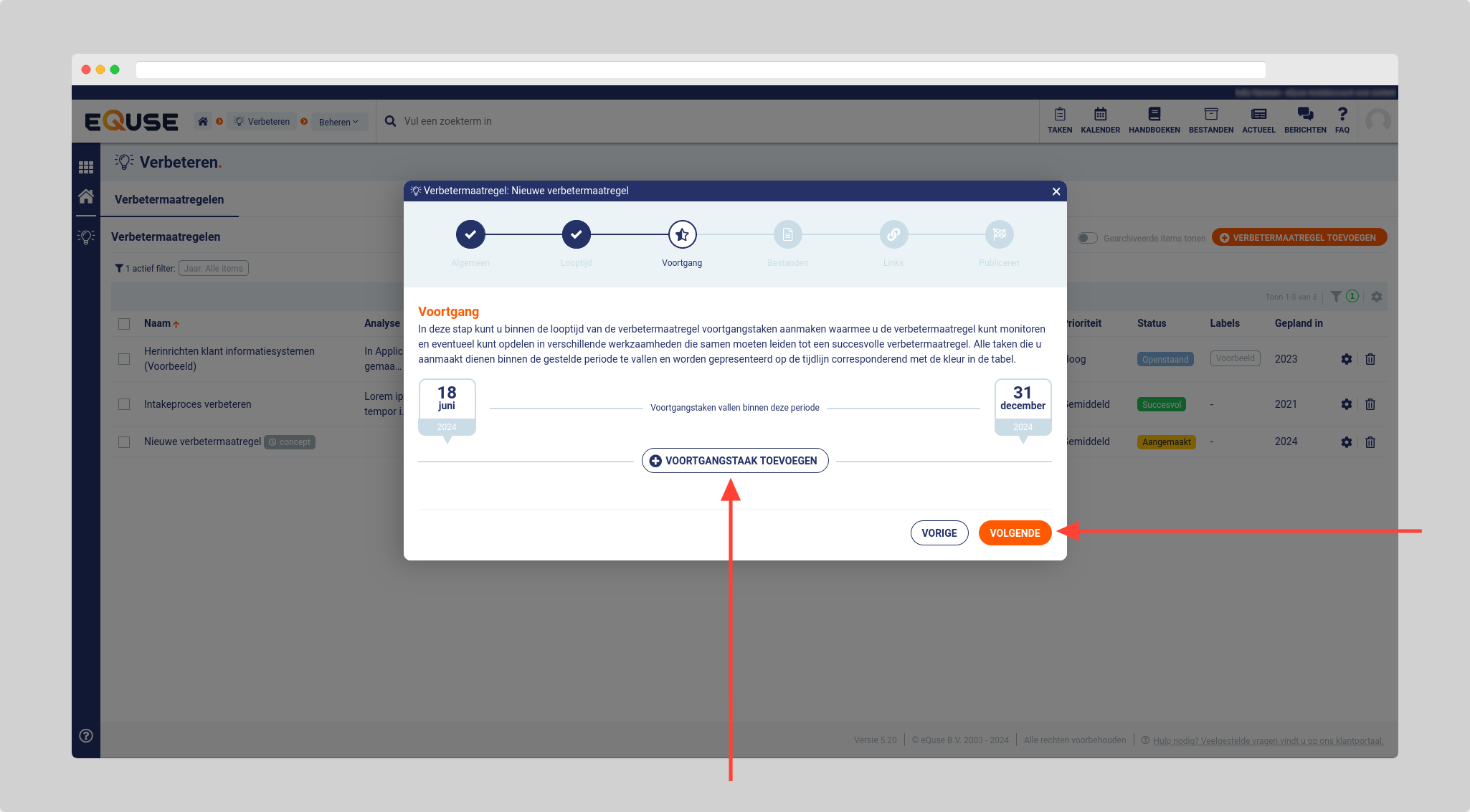 - Maak één of meerdere voortgangstaken aan binnen de looptijd van de verbetermaatregel en klik op volgende.