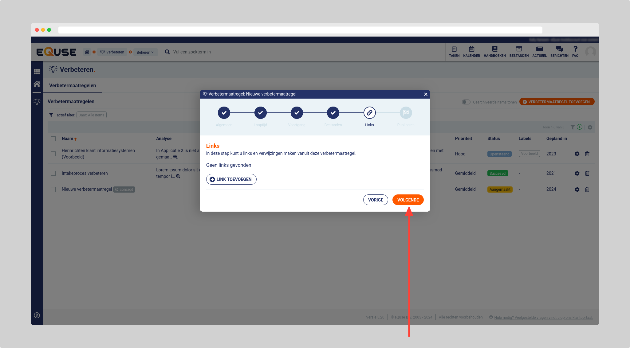 - Voeg eventueel koppelingen toe naar andere eQuse modules en klik op volgende.