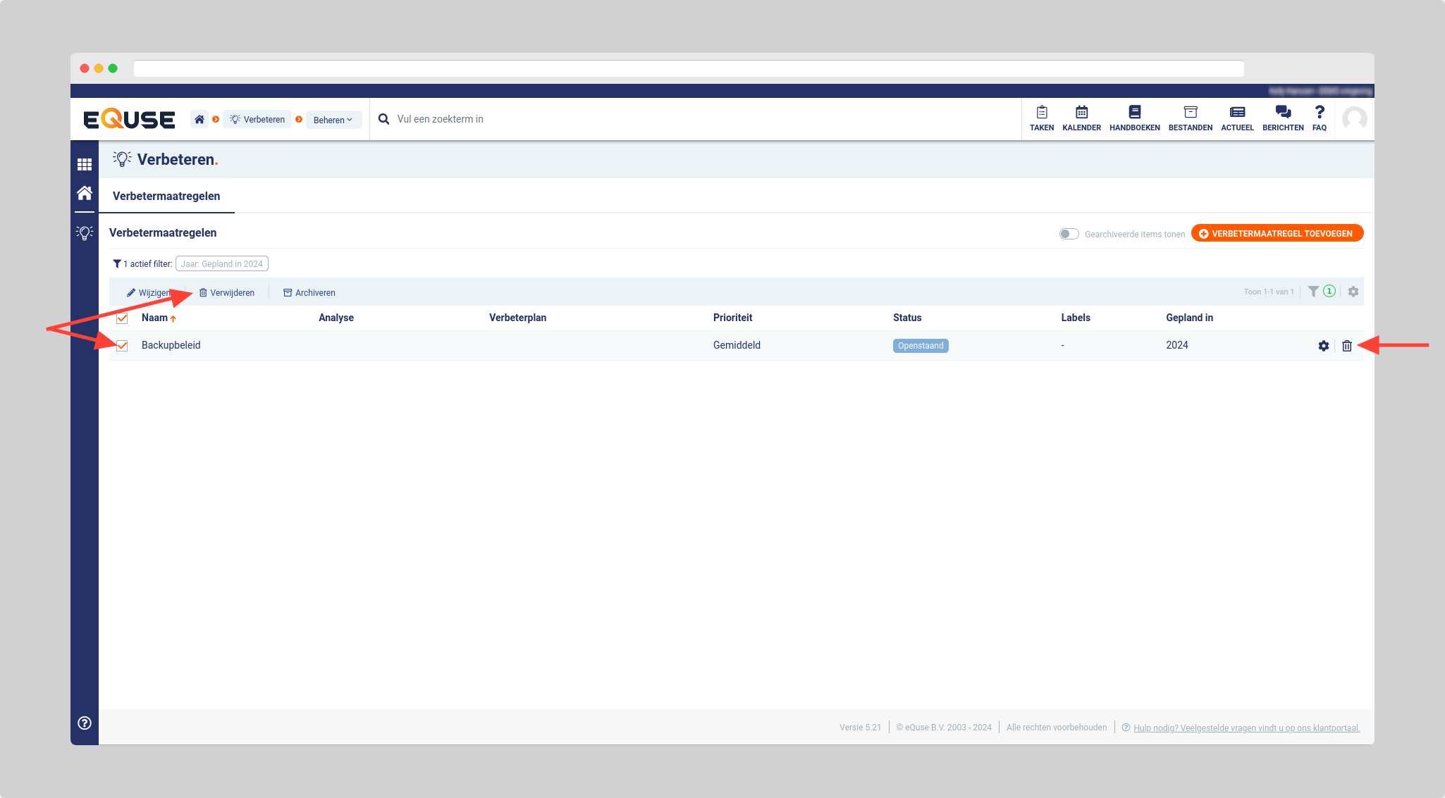 - Selecteer de verbetermaatregel die u wilt verwijderen door het selectievakje aan te klikken en klik vervolgens op verwijderen, of klik in plaats daarvan op het prullenbak icoontje.
