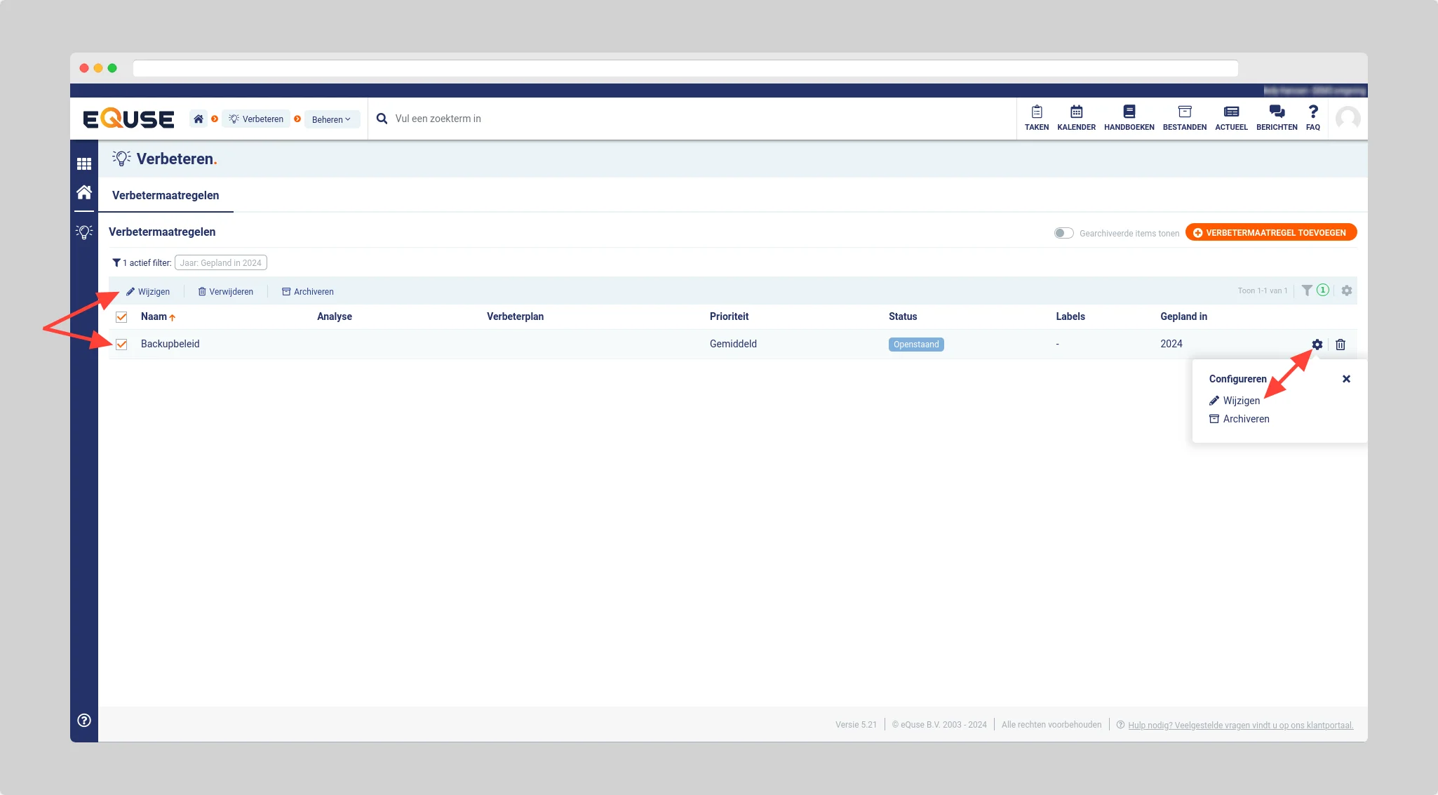 - Selecteer de verbetermaatregel die u wilt wijzigen door het selectievakje aan te klikken (of klik op het tandwiel icoontje) en klik op wijzigen.