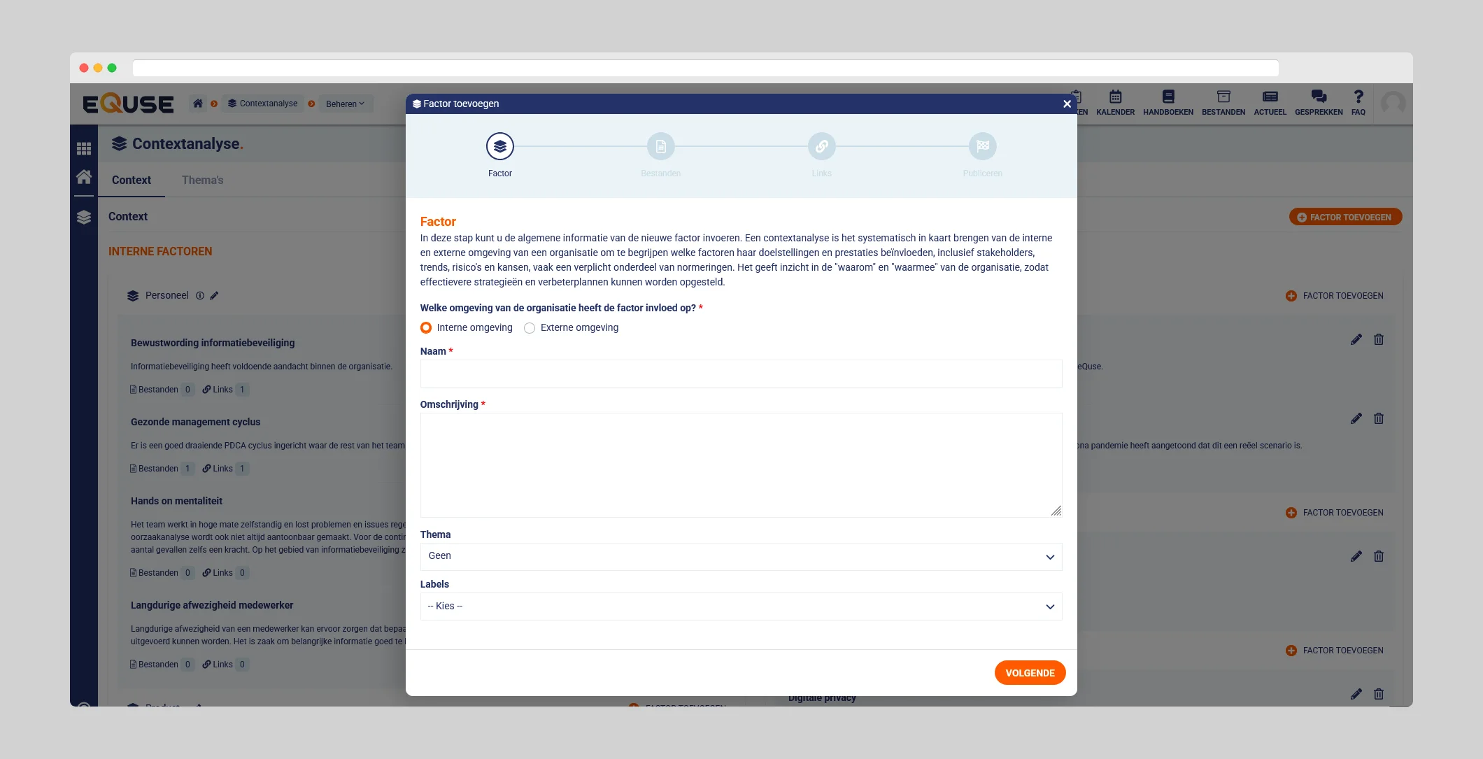 In de Contextanalyse legt u vast welke interne en externe factoren van invloed zijn op het behalen van organisatiedoelstellingen en het beheersen van risico’s. Door interne en externe factoren thematisch te structureren en te verrijken met bestanden en links, ontstaat een gedeeld en actueel referentiekader.