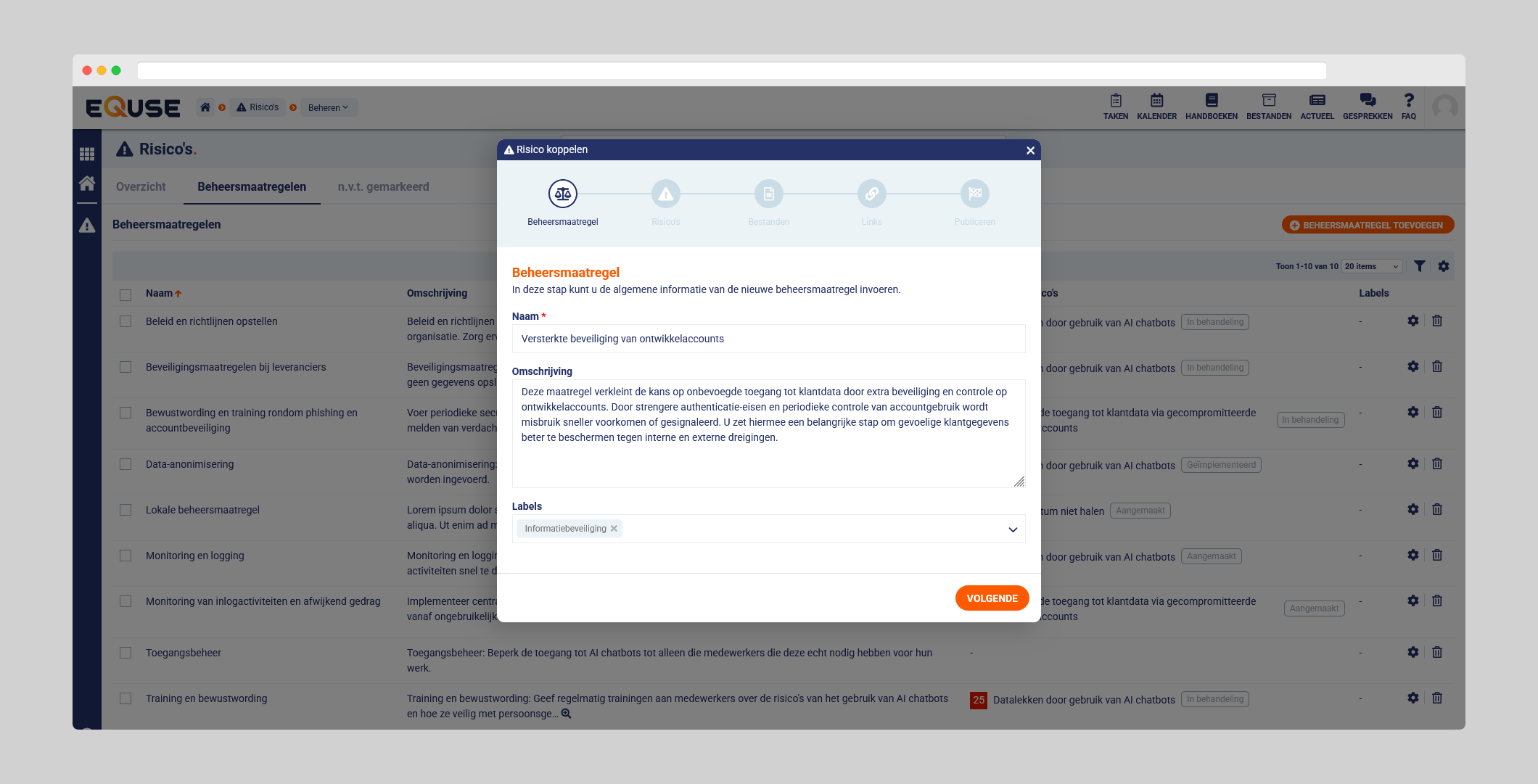 Binnen de module Risico’s kunt u nu beheersmaatregelen afzonderlijk beheren, in plaats van deze alleen als tekst bij een risico vast te leggen. Dit maakt het eenvoudiger om maatregelen te hergebruiken, te actualiseren en consistent toe te passen bij meerdere risico’s. U behoudt beter overzicht over de status en voortgang van maatregelen, los van individuele risico’s. Zo houdt u grip op de beheersing van risico’s.